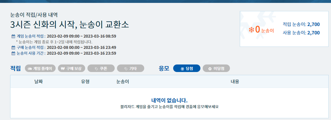 경쟁전 3 시즌이 열리면서 새로 시작한 3 시즌 신화의 시작, 눈송이 교환소... 오버워치 2 가 나온 후 진행한 눈송이 이벤트는 지금까지는 블리자드의 실수? 의도? 인지는 모르겠지만 월, 목이 100% 경품이 올라온다고 치면 월요일에 배틀넷에 100% 경품 광고 배너가 떠서 월요일을 경쟁이 느슨하고 서버도 잘 안 터졌었는데 이번 이벤트는 토요일부터 100% 배너가 떠서 그런지 월요일도 서버가 터지네요.