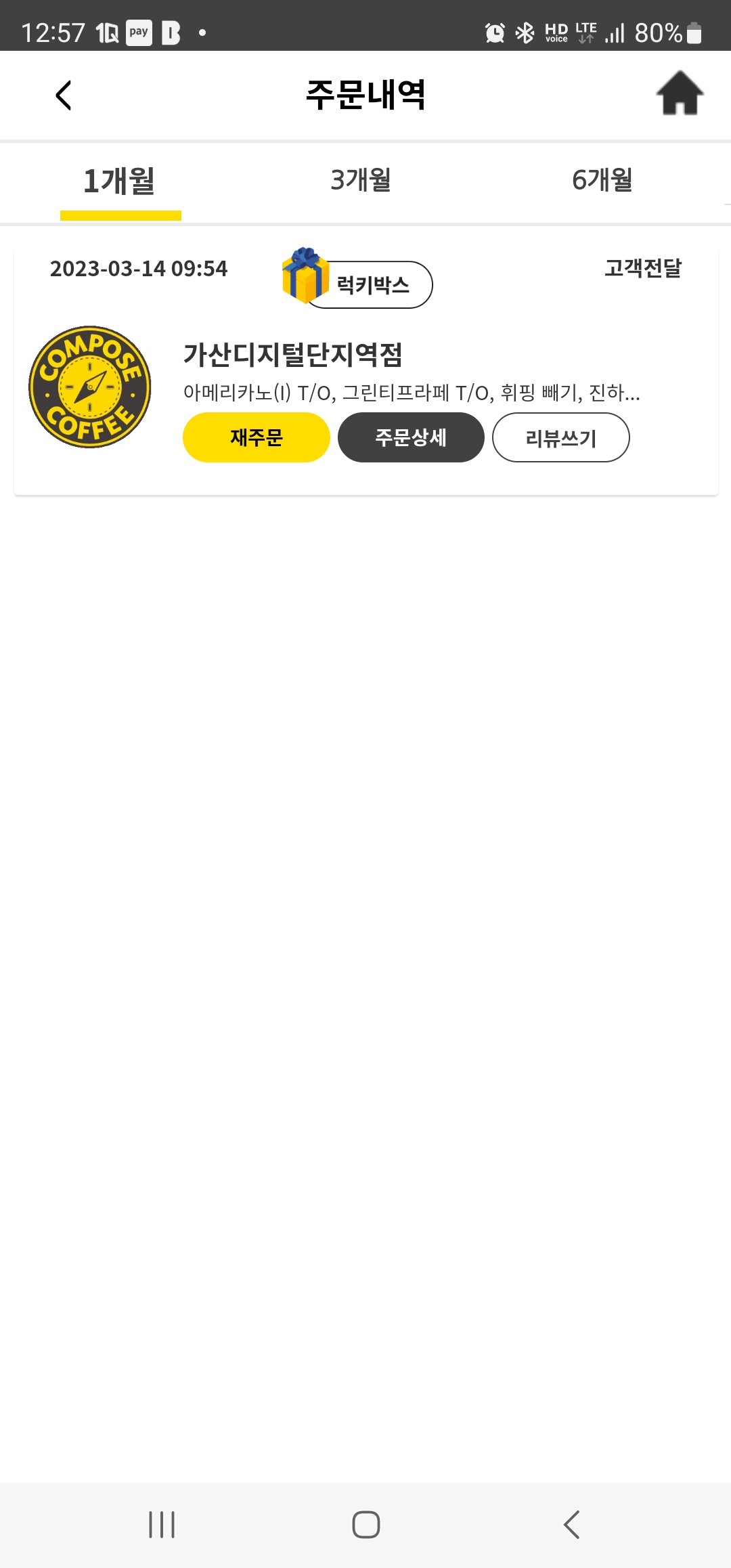그리고 다음날 14일 어플을 통해 주문을 했고,주문이 완료 처리가 된 다음 주문내역에 럭키박스 버튼이 생겼습니다.