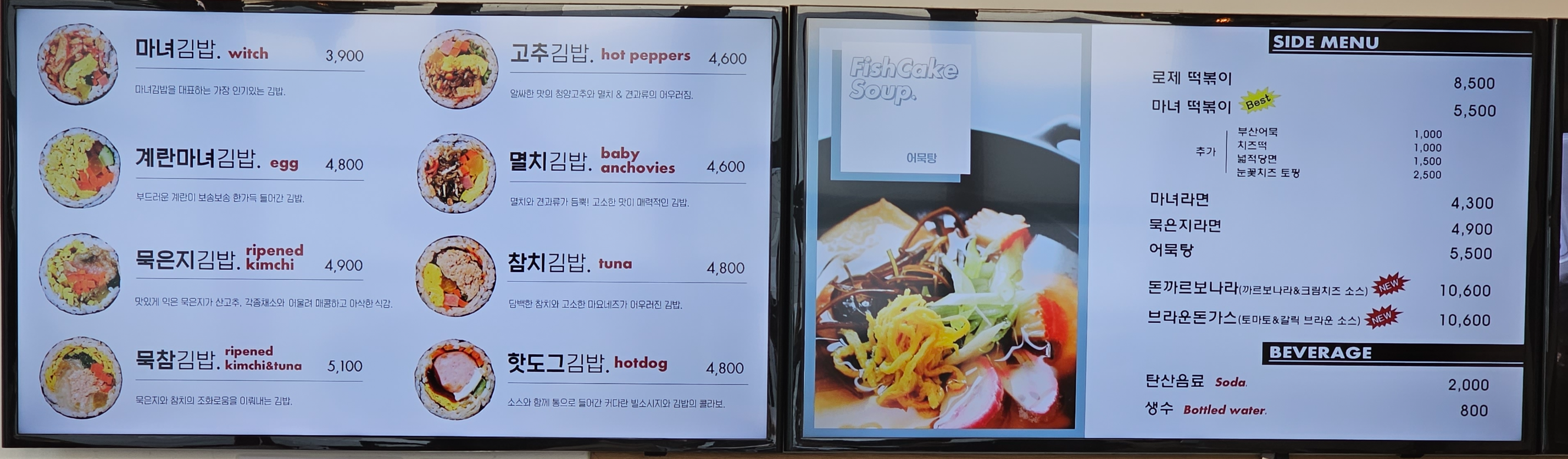 김밥가격은 저번 방문([문정] 마녀김밥 - 핫도그김밥, 마녀김밥)때랑 똑같은 것 같습니다.. 다만 로제 떡볶이는 1,000원 정도 인상 한 것 같네요. 이번에는 저번에 먹어봤던 마녀 김밥(3,900원)과 핫도그 김밥(4,800원) 그리고 안 먹어본 고추김밥(4,600원)을 구매했습니다.