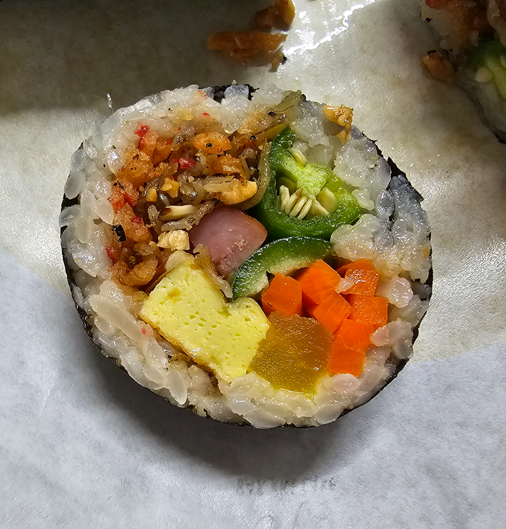 고추김밥은 청양고추가 들어가 있고, 튀김부스러기와 함께 멸치와 견과류가 들어가 있습니다. 고추가 꽤 매운 게 들어가서 매운맛 좋아하는 사람에겐 딱 맞는 맛인 것 같습니다. 다만 아쉬운 점은 튀김부스러기와 멸치가 막상 먹어보면 식별이 잘 안 되는 느낌이라 그냥 마녀김밥에 고추가 들어간 것 같은 느낌도 들더군요.
