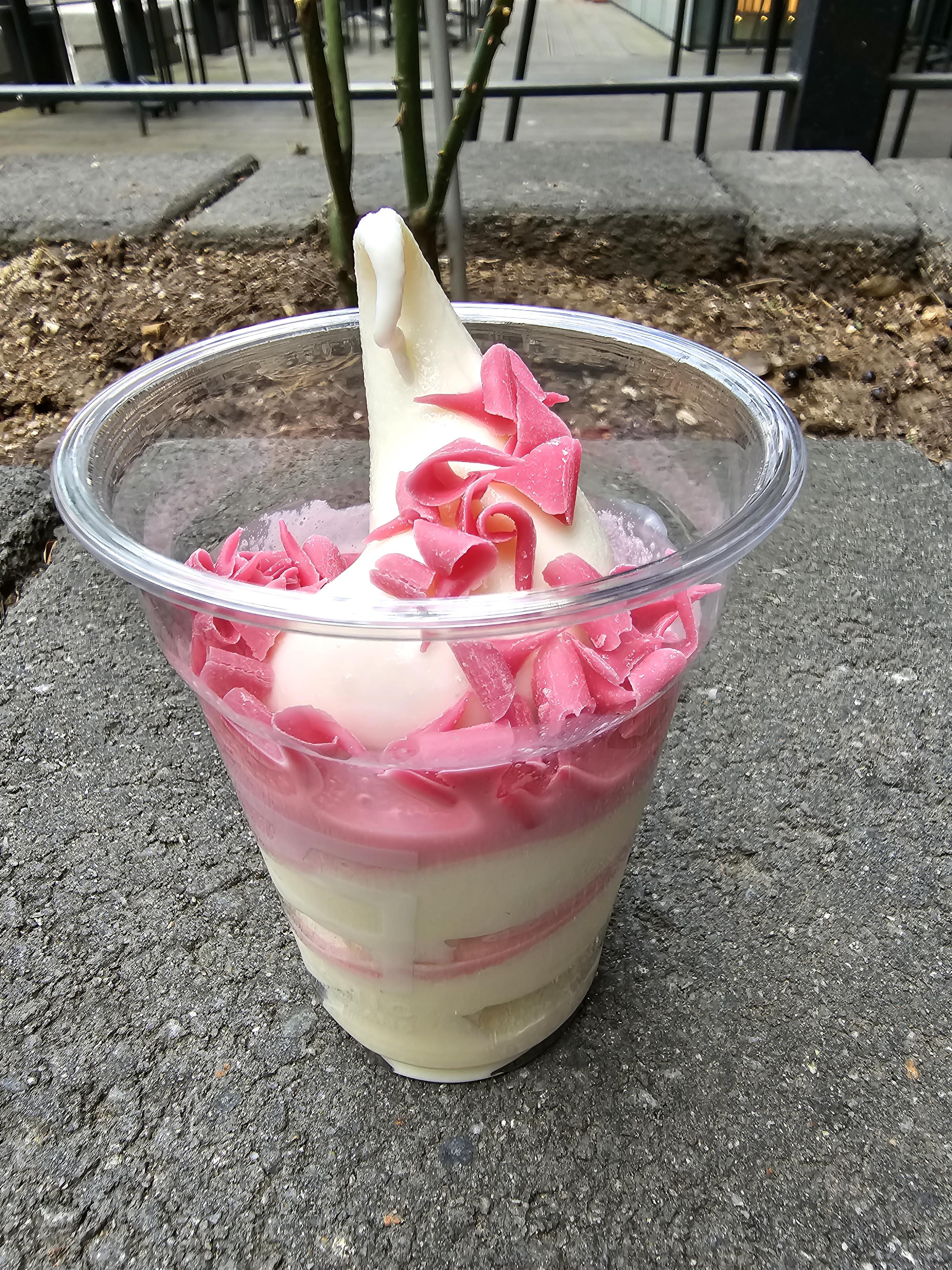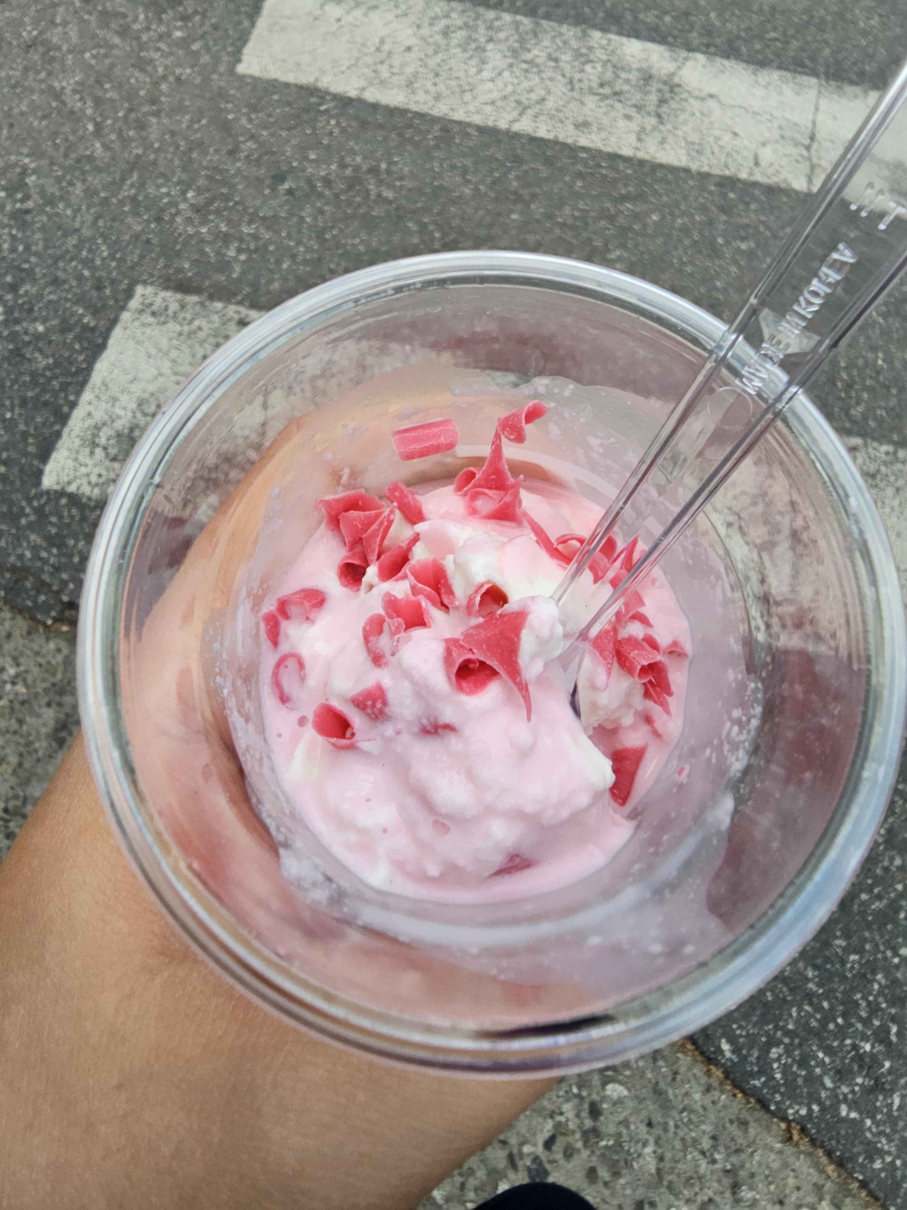 맛은... 흠... 딸기 맛?이라고 하면 딸기맛 같기는 한데 제 입에는 케이크 위에 올라가는 인공적인 맛의 장식용 화이트 초콜릿 같았습니다. 보기엔 이뻤는데 맛은 그저 그러네요. 우유 아이스크림 자체가 맛있어서 맛있게 먹었지만 토핑은 그냥 눈으로 보기 위한 용도 정도인 것 같습니다.