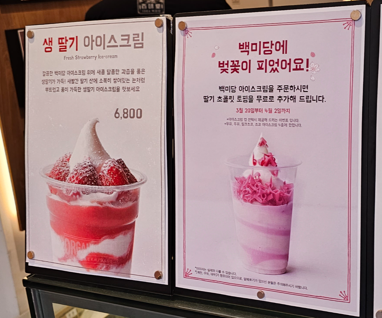 평소처럼 컵, 콘 중에 고민하다가 옆에 '백미당에 벚꽃이 피었어요!' 라는 이벤트를 진행 중이라 3월 20일부터 4월 2일까지 무료로 딸기 초콜릿 토핑을 추가해 주는 이벤트가 진행 중이었습니다. 마침 가산에 벚꽃도 많겠다. 무료기도 하고, 콘은 안된다고 하길래 컵으로 했습니다.