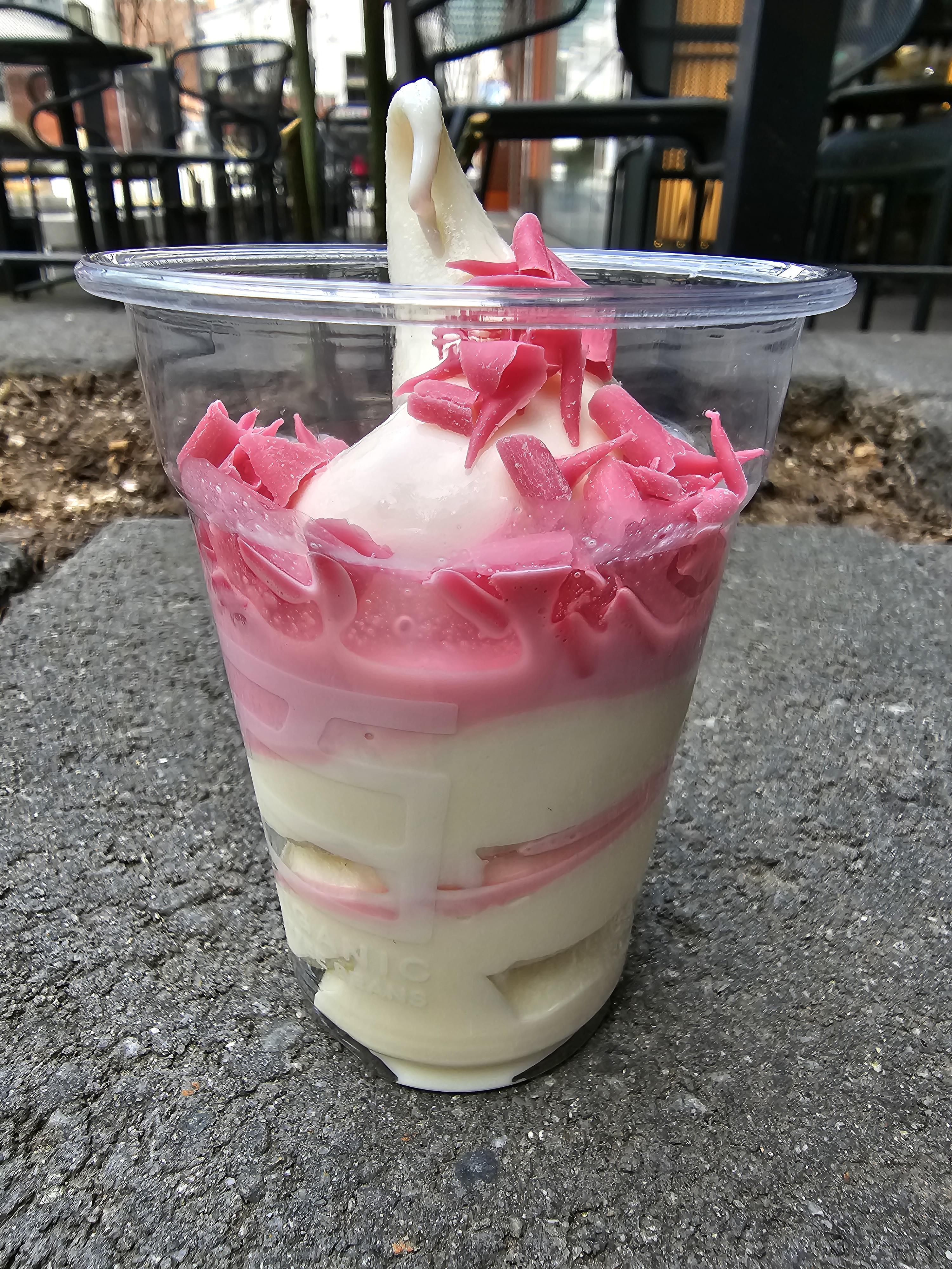 그냥 위에 토핑으로 초콜릿만 뿌려주는 줄 알았는데, 분홍색 액체? 같은 초코도 뿌려 주더군요. 이미지처럼 실제로도 우유 아이스크림 사이사이 핑크색이 보입니다.