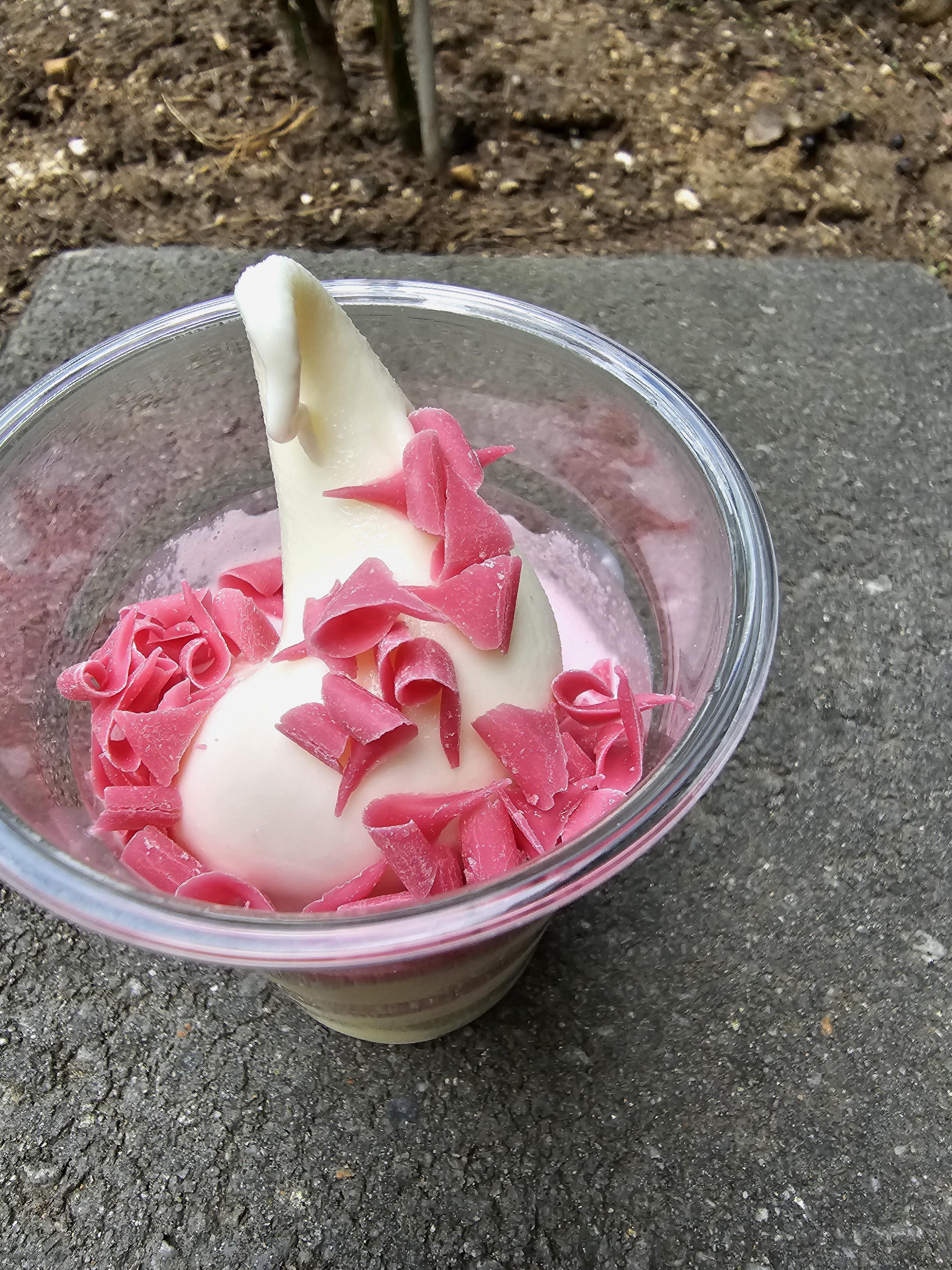 그냥 위에 토핑으로 초콜릿만 뿌려주는 줄 알았는데, 분홍색 액체? 같은 초코도 뿌려 주더군요. 이미지처럼 실제로도 우유 아이스크림 사이사이 핑크색이 보입니다.
