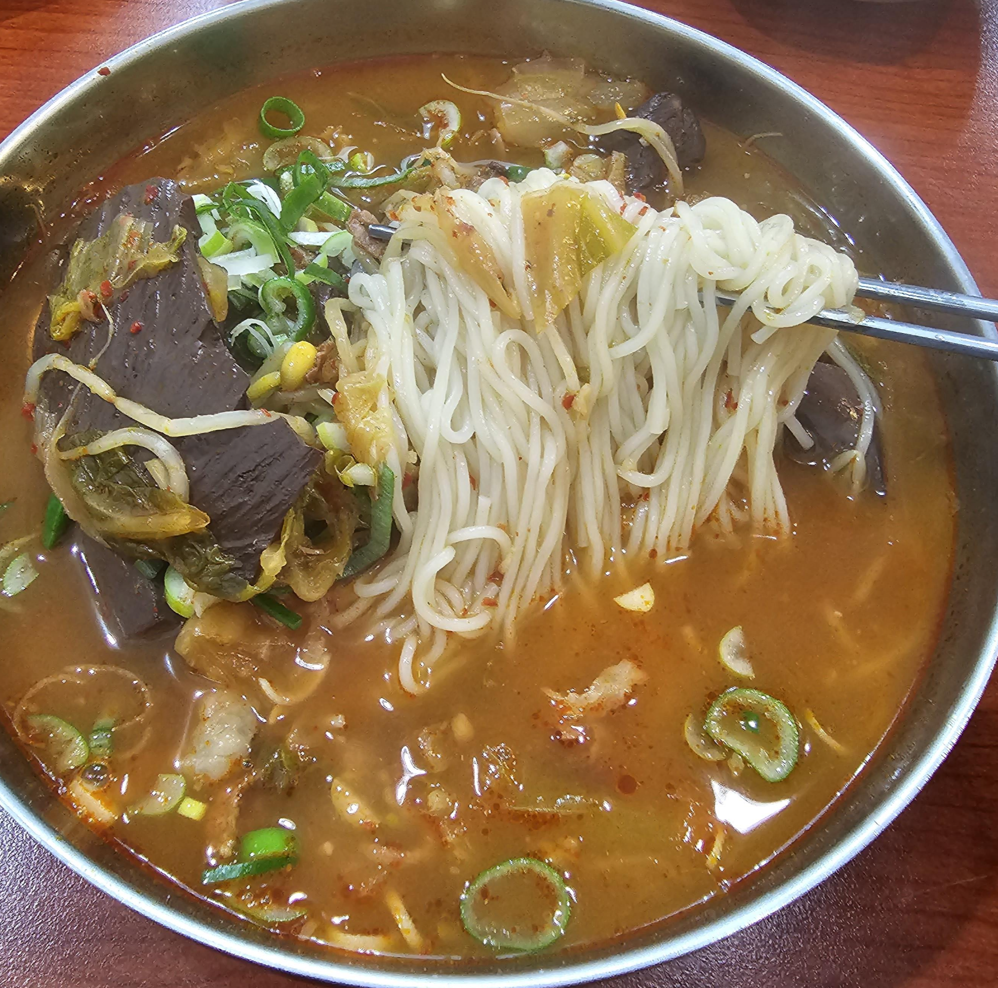 선지국수는 위에 생파가 올라가 있고, 선지는 꽤 큰 덩어리로 4~5덩어리가 들어있었습니다. 그리고 콩나물과 배추가 들어있고, 적지만 고기도 들어있었습니다. 전체적으로 선지해장국에 소면이 들어간 느낌이었습니다.