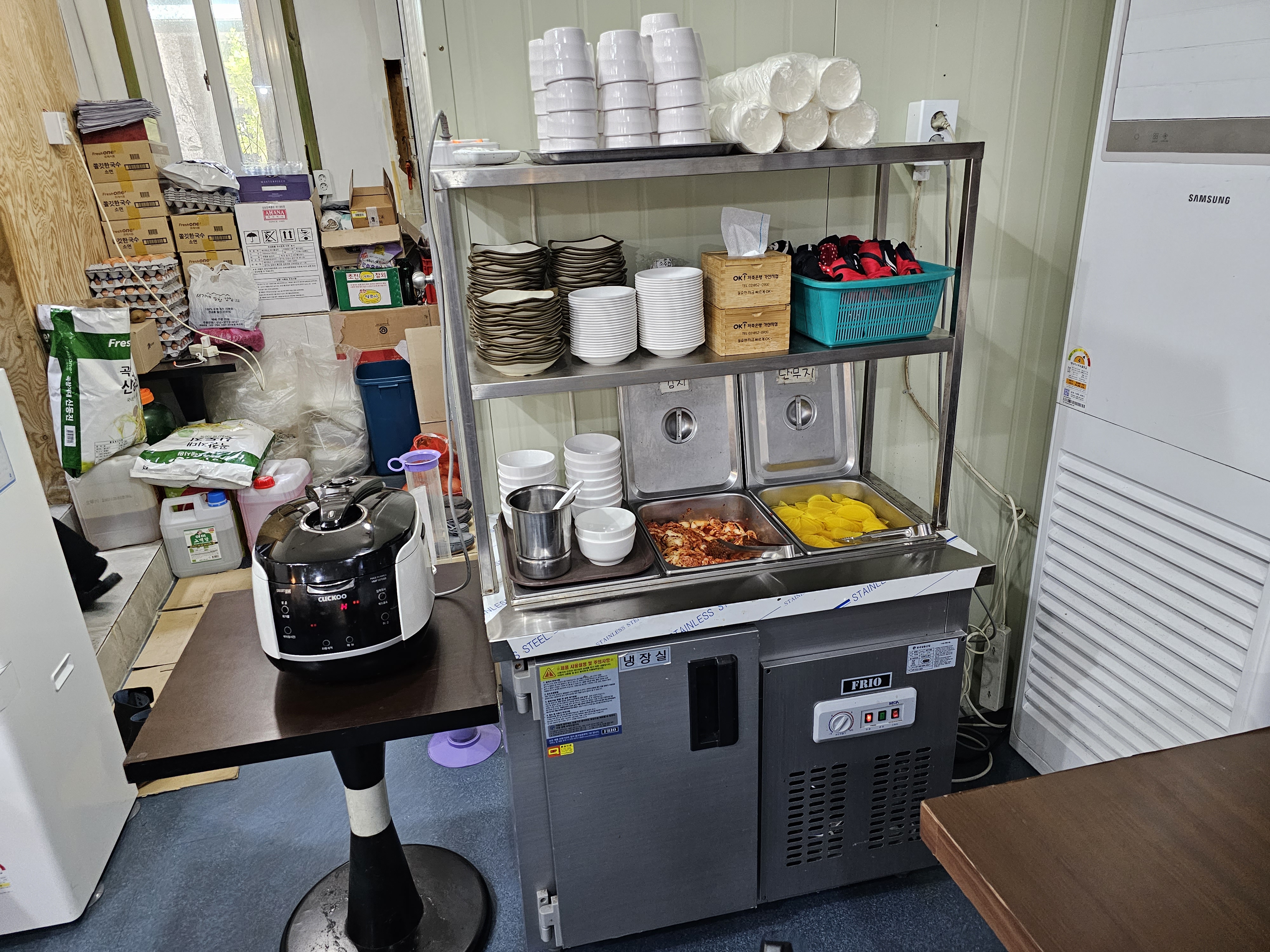 한쪽에 셀프코너가 있어서 김치와 단무지 그리고 쌀밥을 셀프로 가져올 수 있고, 물은 정수기에서 셀프로 떠먹는 형식이었습니다.