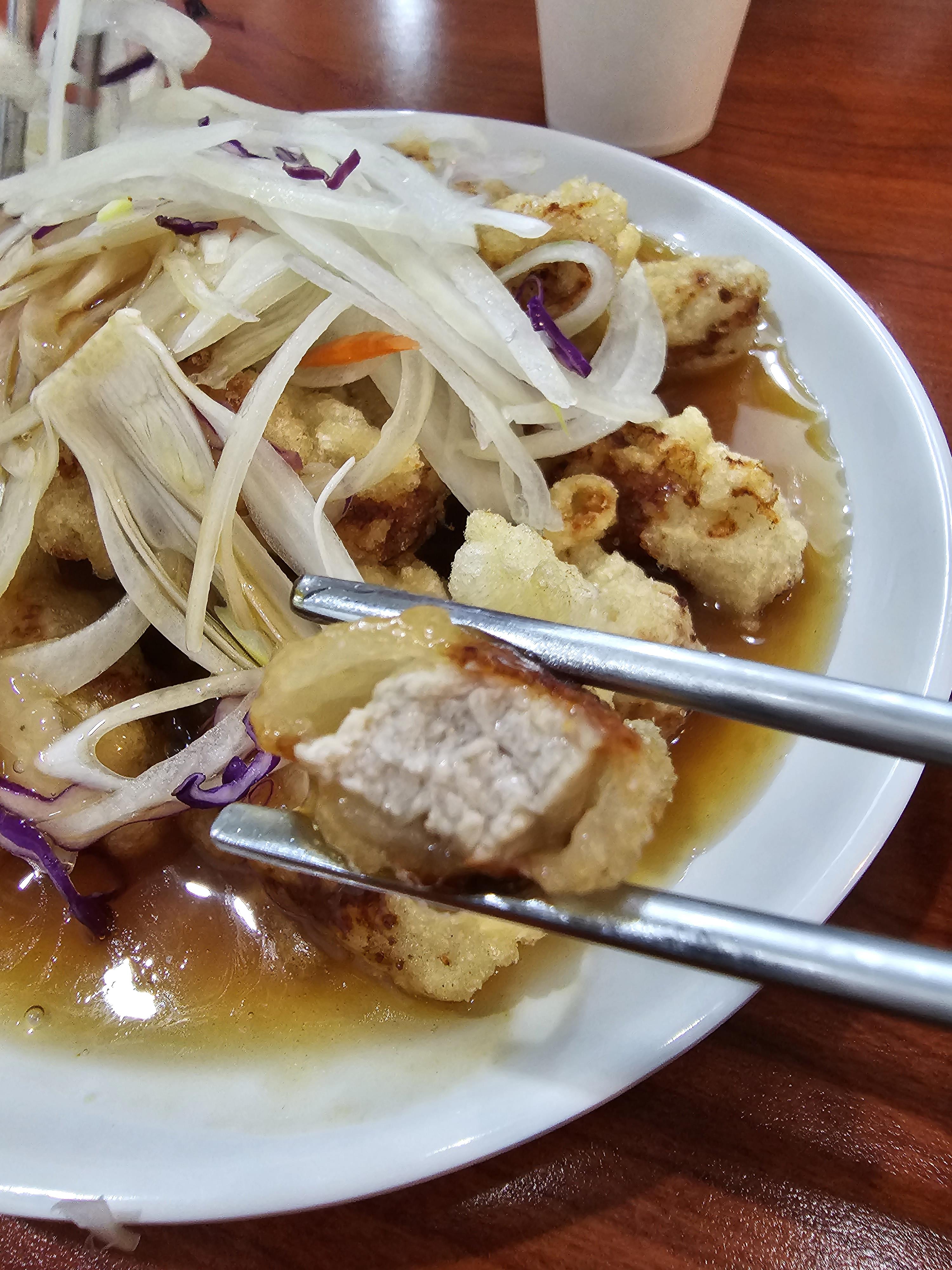 탕수육은 가격대비 양이 괜찮게 나오는 것 같았습니다. 위에 생 양파가 올라가 있는데 양파를 좋아해서 더 맛있게 느껴졌던 것 같네요. 탕수육 자체는 약간 분식집 스타일? 느낌의 맛이었고, 소스는 부어져서 나오는데, 소스는 일반적인 탕수육보다 맛이 묽은? 느낌이었습니다.
