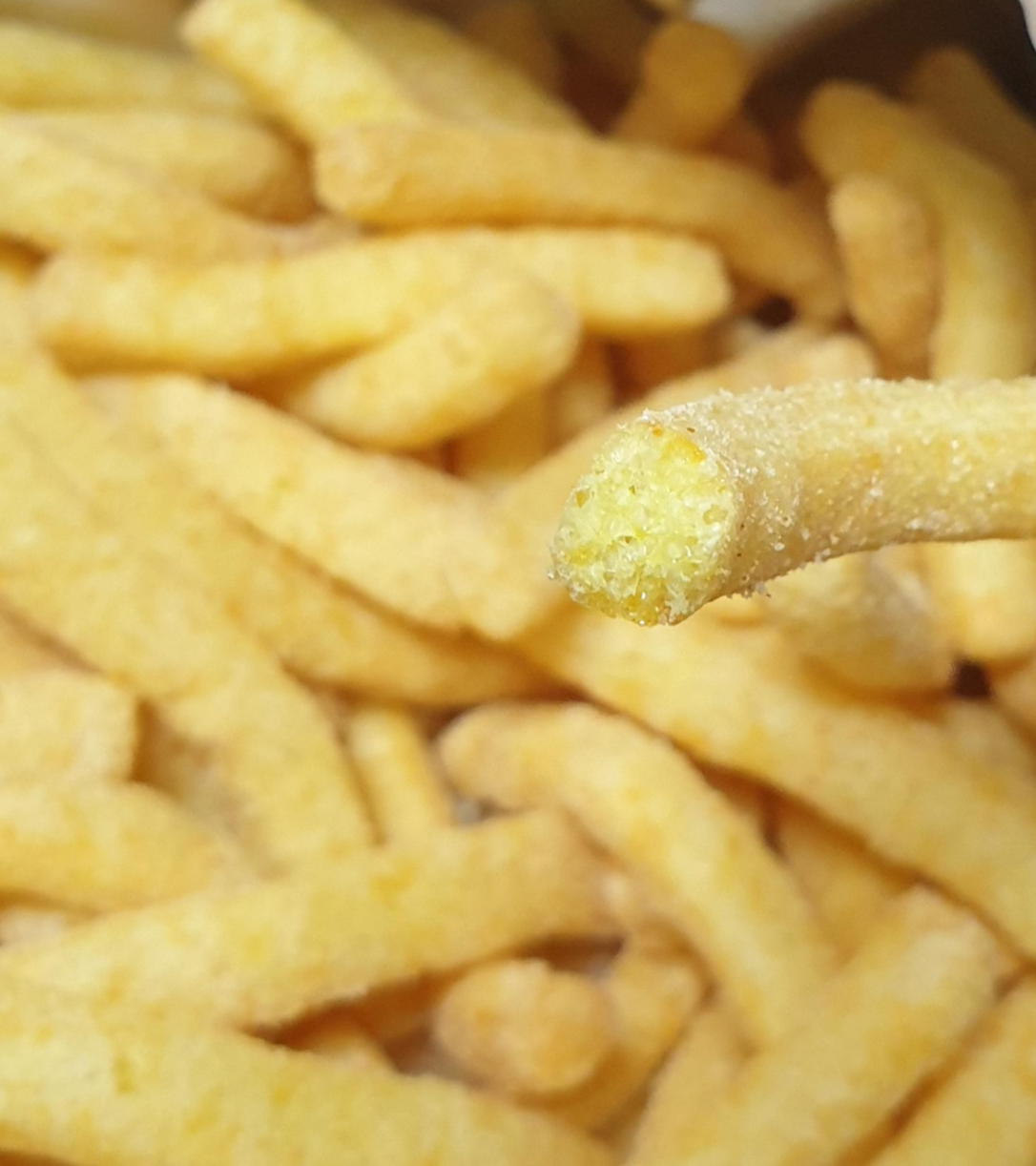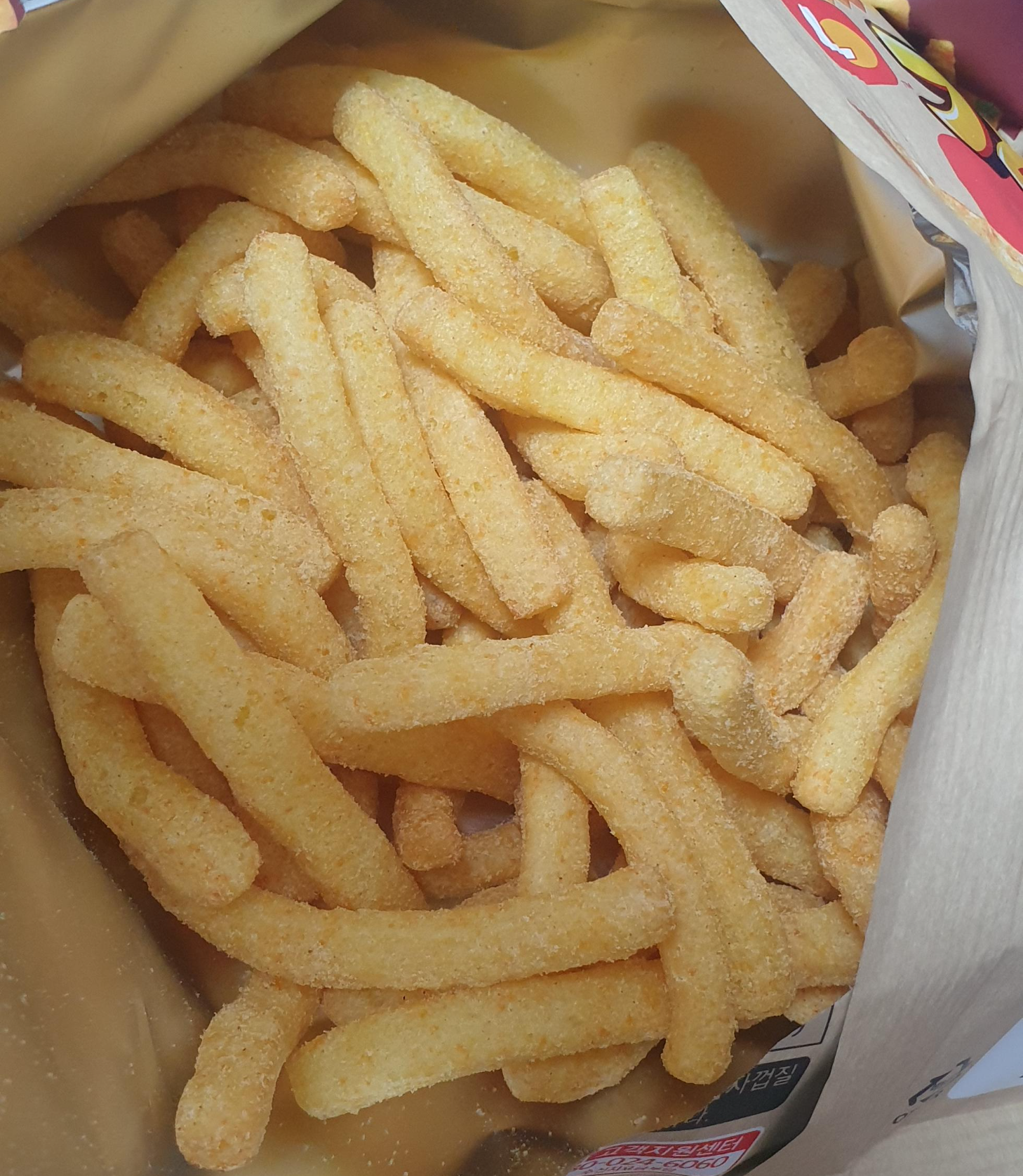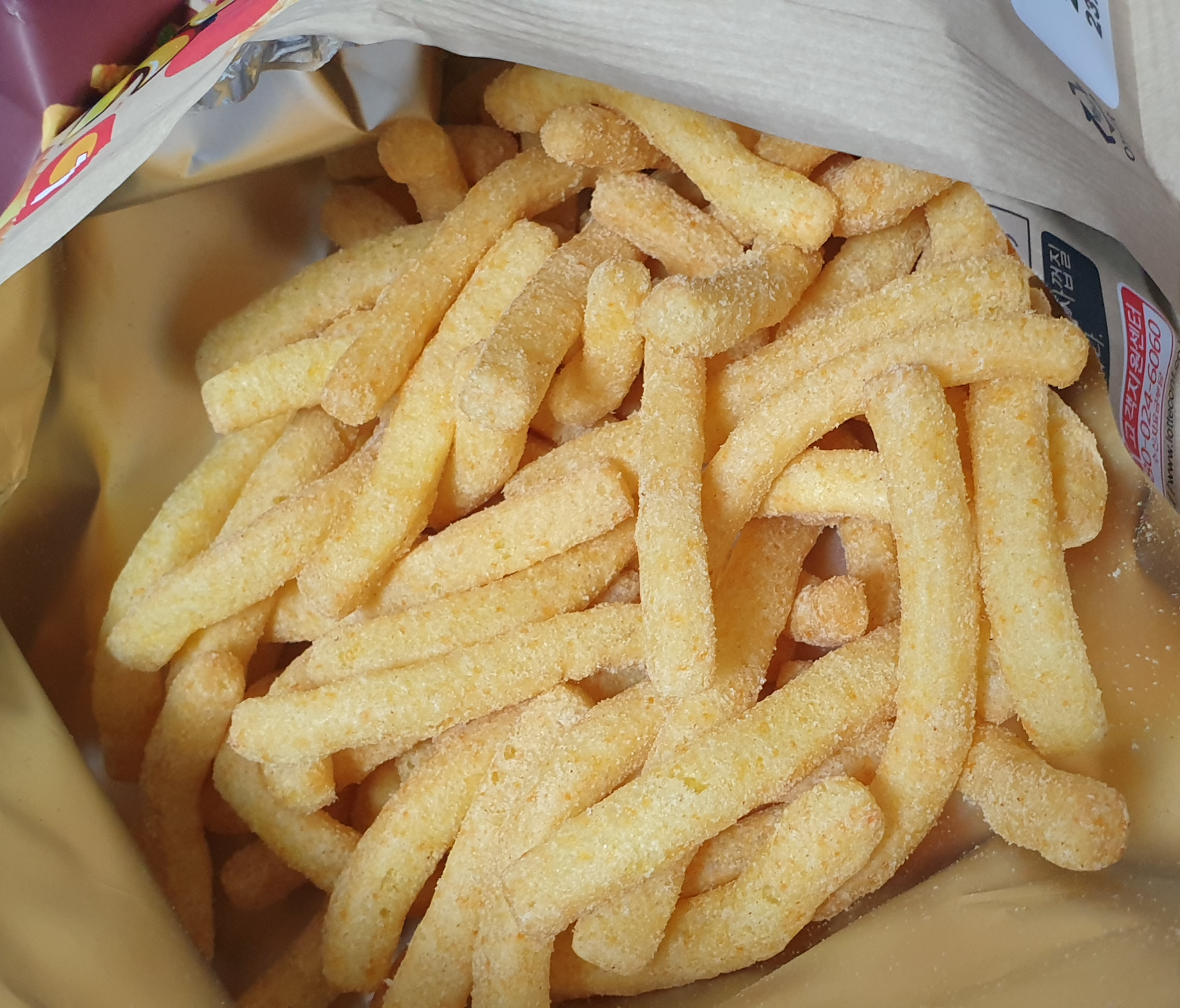 과자의 모양은 새우깡 같기도 하고 감자튀김 같이 생기기도 했습니다.