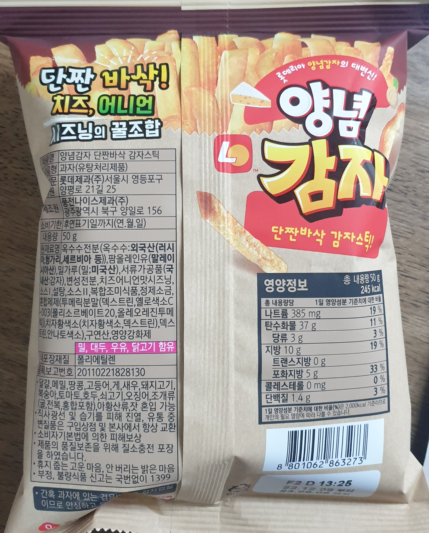 맛 자체는 개인적으론 양파링?과 감자과자 가운데 어딘가 있는 느낌이었습니다. 바삭한 식감 때문에 감자튀김 같은 느낌은 없었고, 과자 자체는 짭짤하고 자극적인 맛이지만 양념감자를 먹을 때의 그 특유의 시즈닝의 뭉친 맛이나 뜨거운 감자튀김과의 시너지를 생각하면 제 기대에는 못 미치더군요.