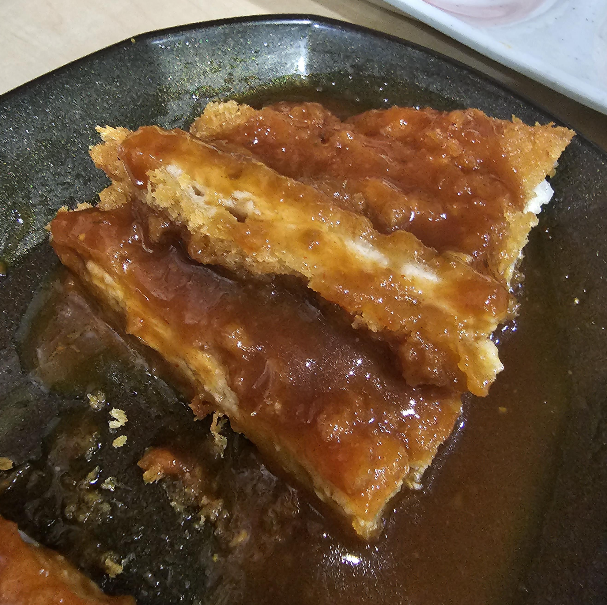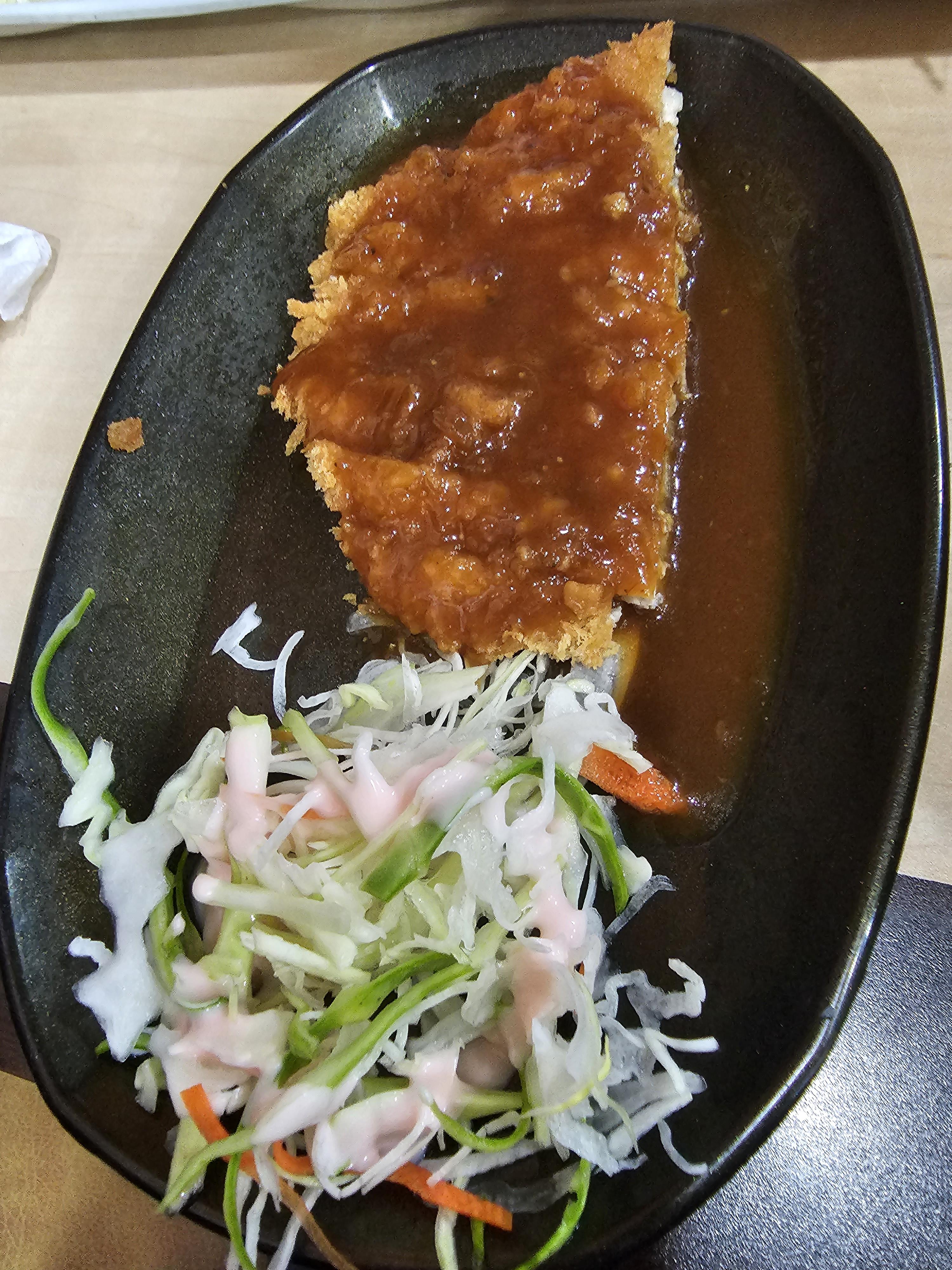 같이 나오는 돈가스는 샐러드와 함께 반쪽이 나오는데 고기는 얇은편인 경양식 돈까스 스타일인것 같습니다. 소스가 부워져서 나와서 튀김옷은 좀 눅눅한 편입니다. 맛은 무난한 돈까스 맛이었습니다.