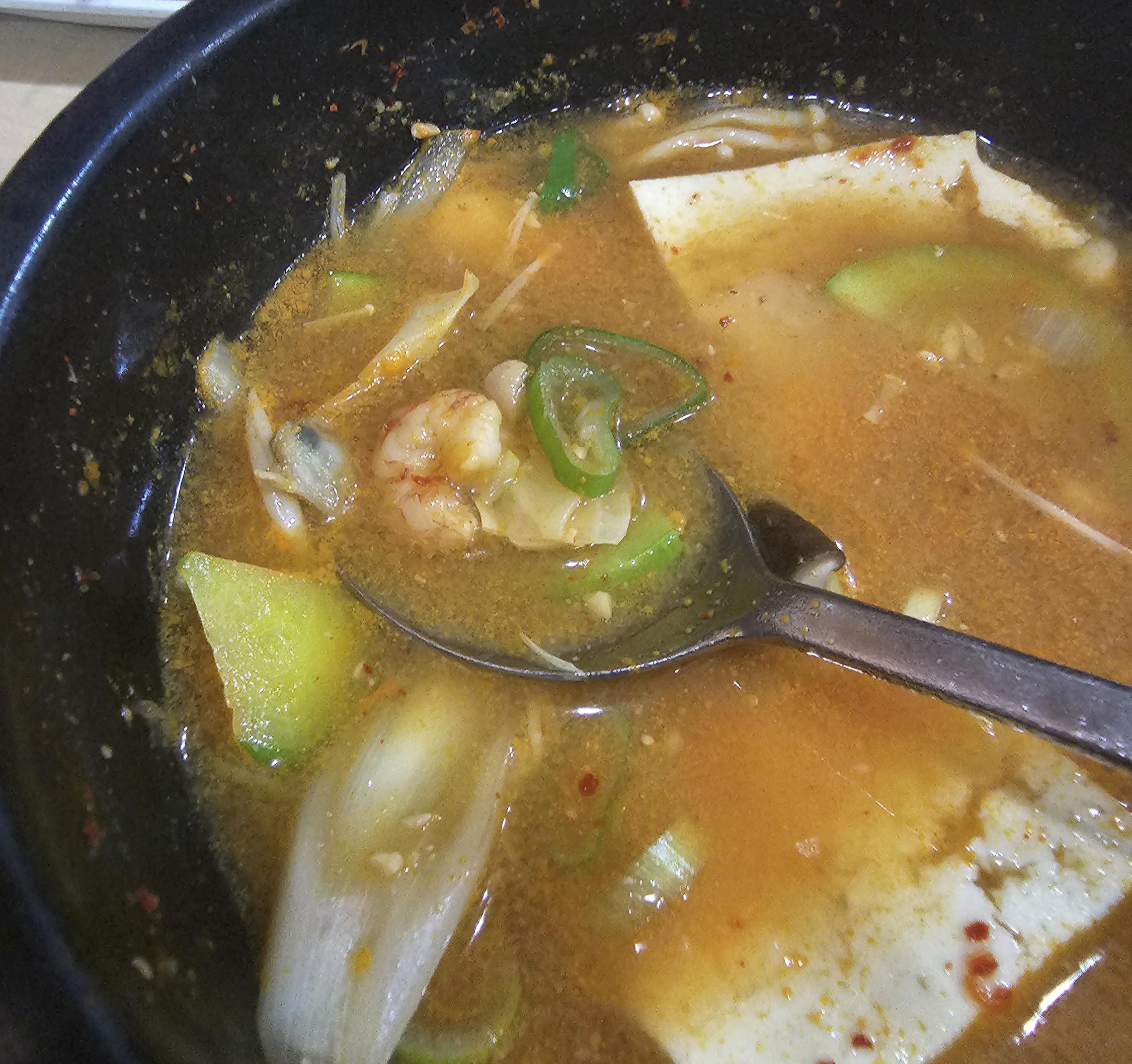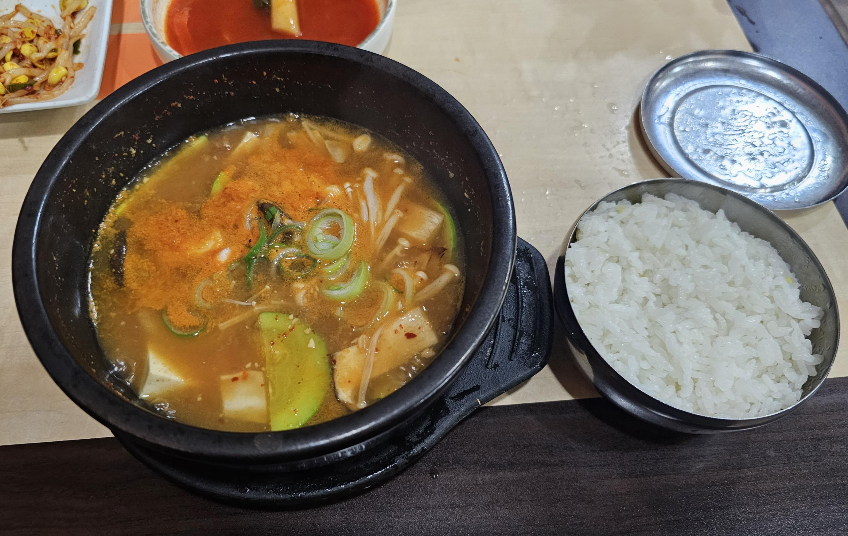 된장찌개는 뚝배기에 나옵니다. 안에는 두부, 호박, 양파, 버섯등이 들어가고 조금이지만 바지락이나 칵테일새우, 가리비살도 들어가 있었습니다. 호박이나 야채는 푹 익혀지진 않았고, 아삭한 식감이 어느정도 남아있었습니다. 찌개지만 간이 짜거나 하진 않았습니다. 무난한 된장찌개맛이었습니다.