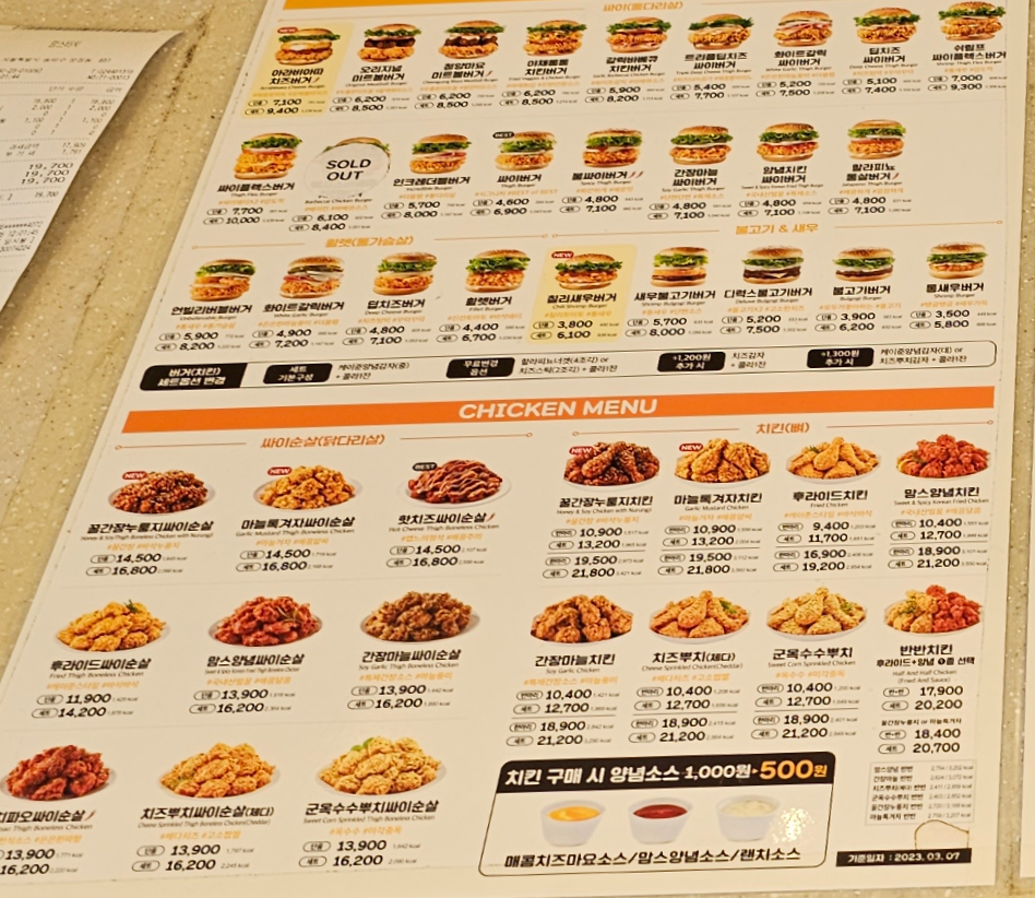 다양한 햄버거와 치킨 종류가 메뉴판에 있었습니다.