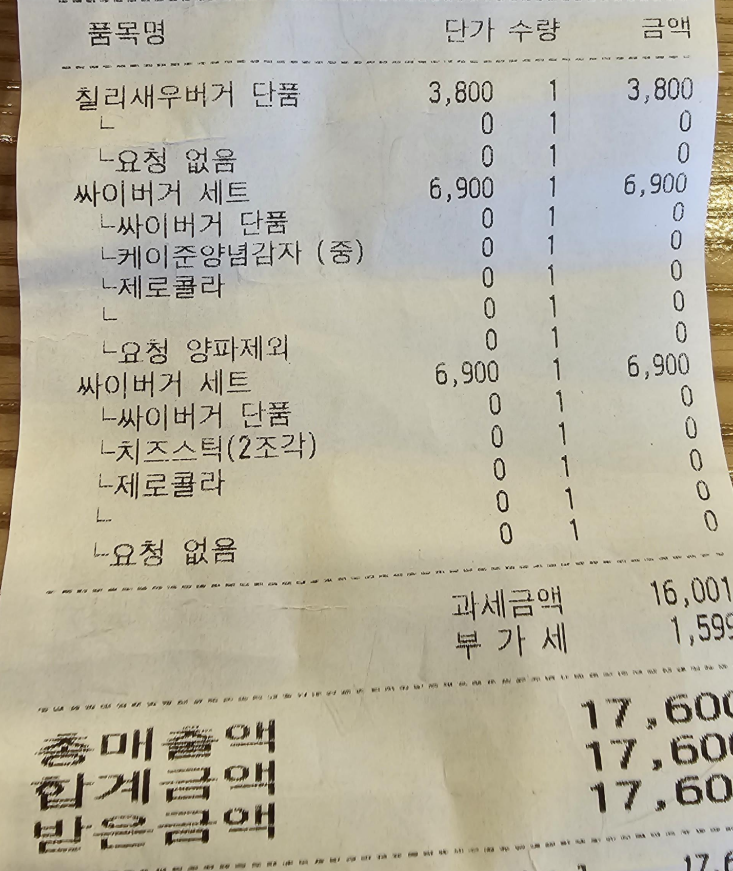 칠리새우버거단품 (3,800원)과 싸이버거 세트(6,900원)를 주문했습니다.