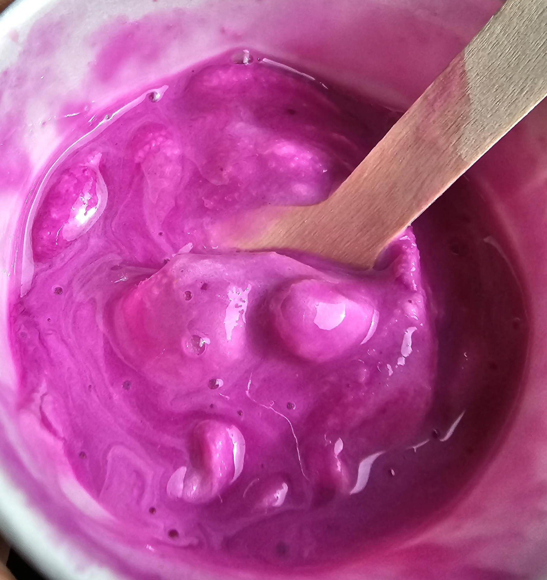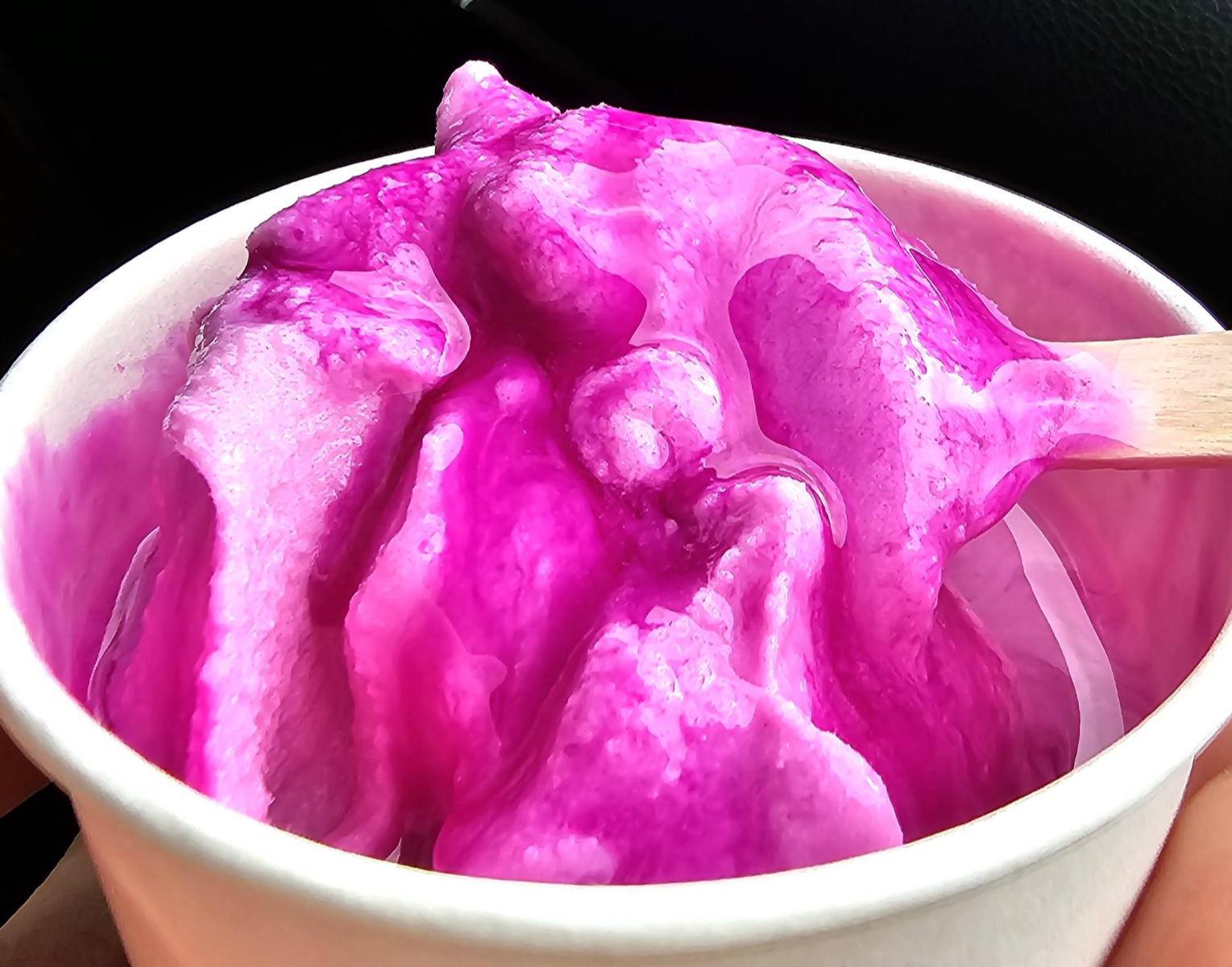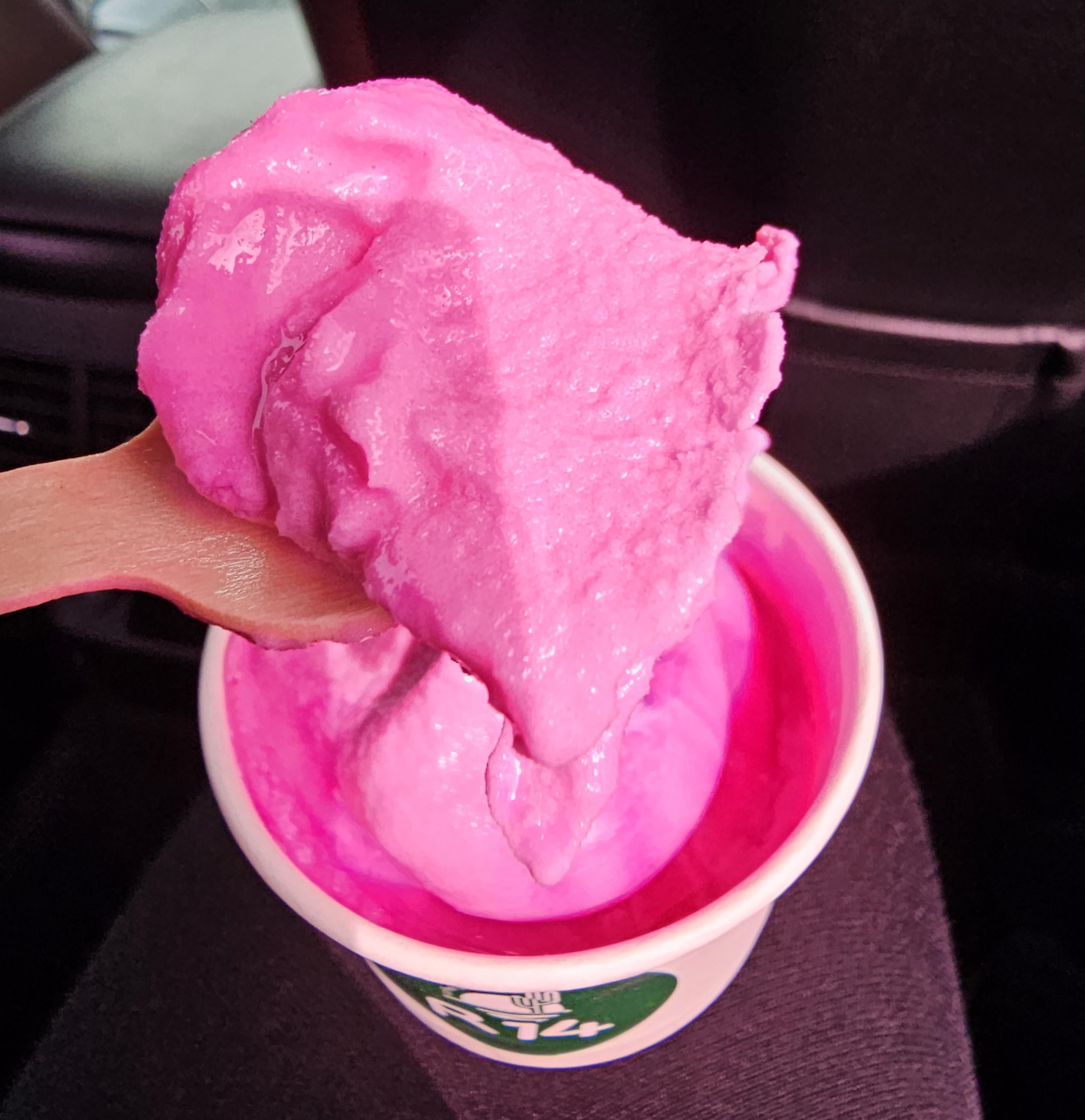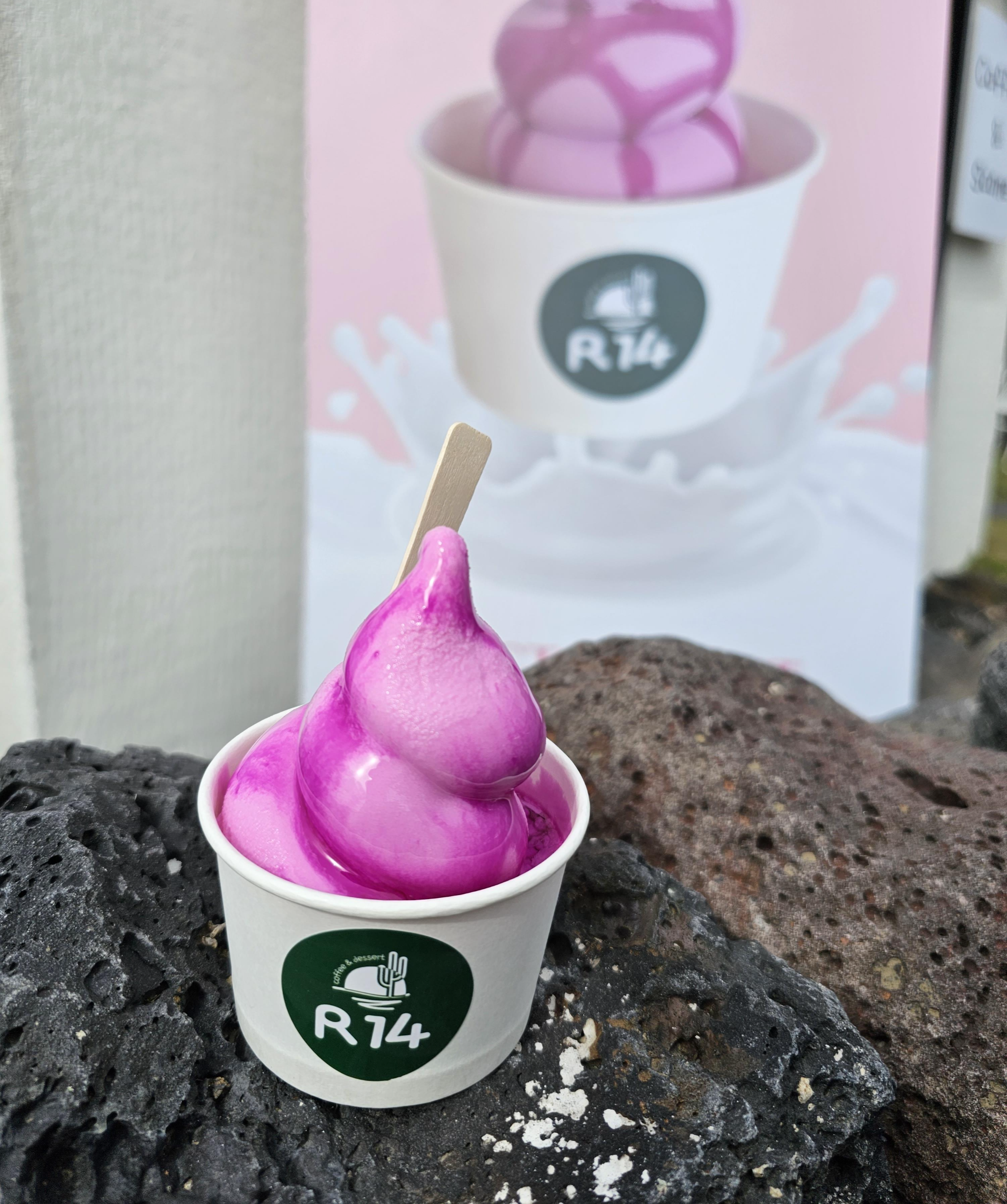 나무 스푼을 같이 주는데 보라색의 아이스크림 위에 백년초 시럽? 같은 게 뿌려져 있는 것 같습니다.
