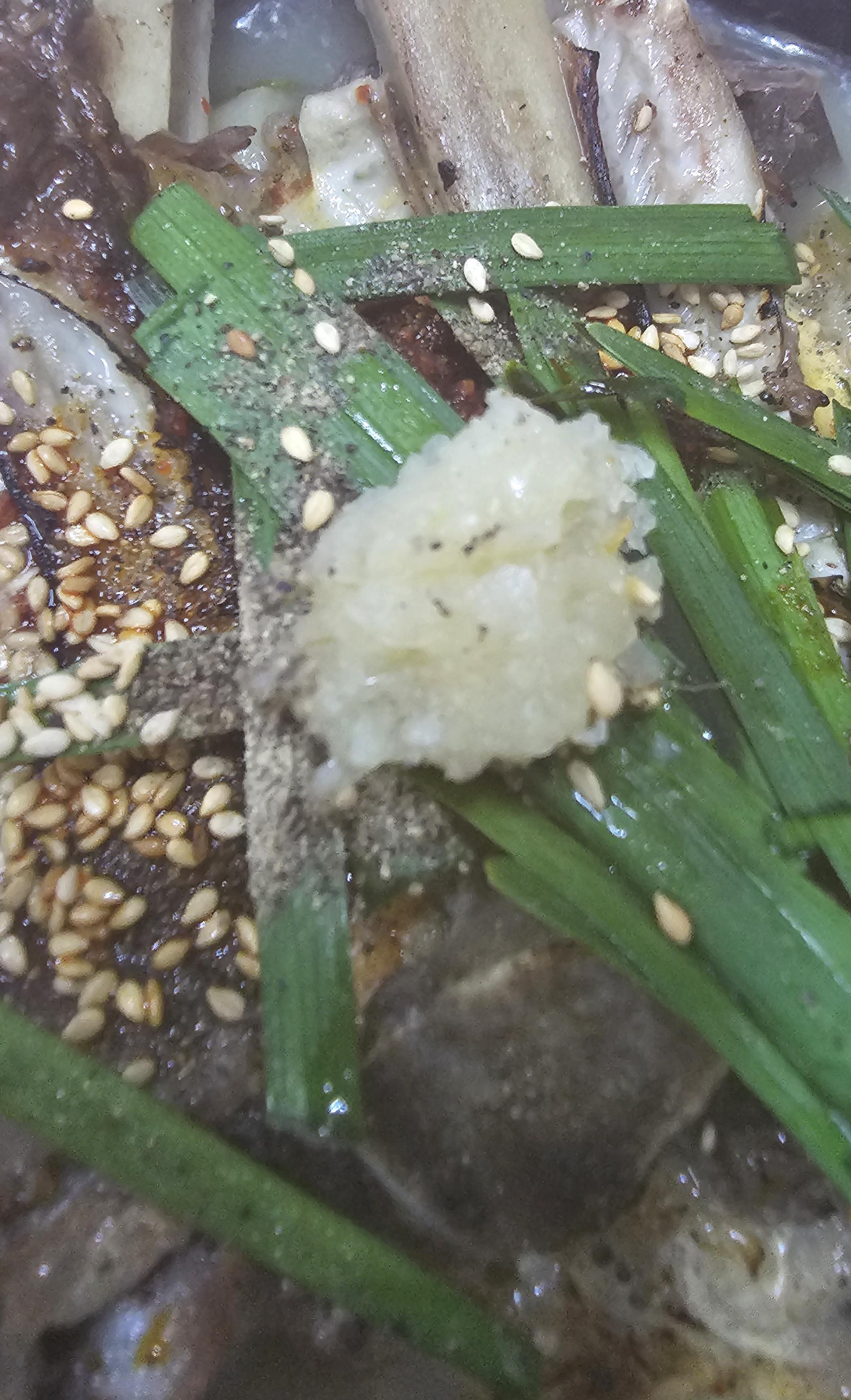 일단 큰 갈비 2개가 눈에 띄었습니다. 그리고 부추와 후추도 보이네요. 갈비 뼈가 커서 더 푸짐해 보였습니다.