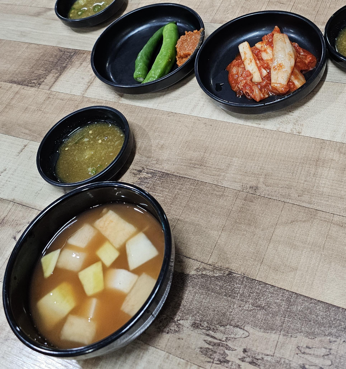 반찬으론 김치와 고추, 쌈장, 고기를 찍어먹을 소스가 나오고 개인당 물김치가 1개씩 나오는데 동치미는 간이 쌘 편이었습니다. 고추가 엄청 매웠습니다.