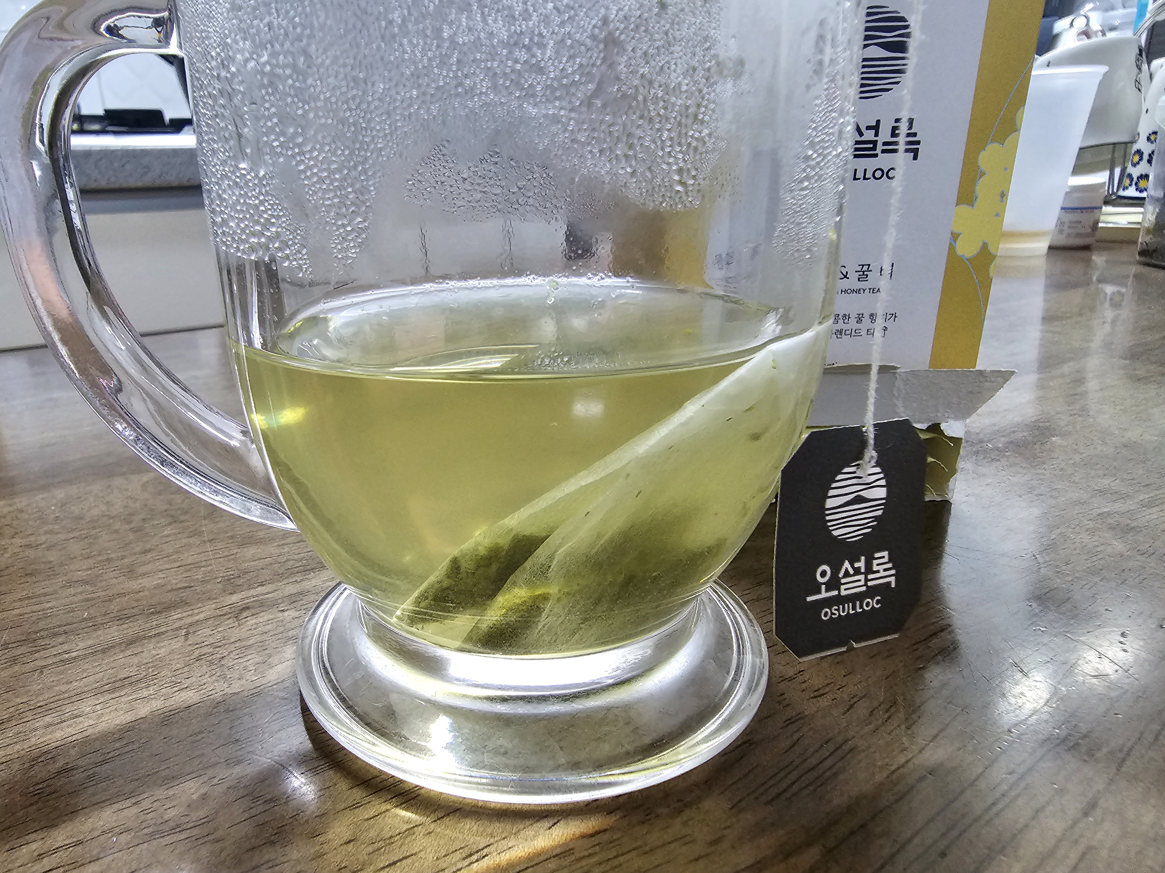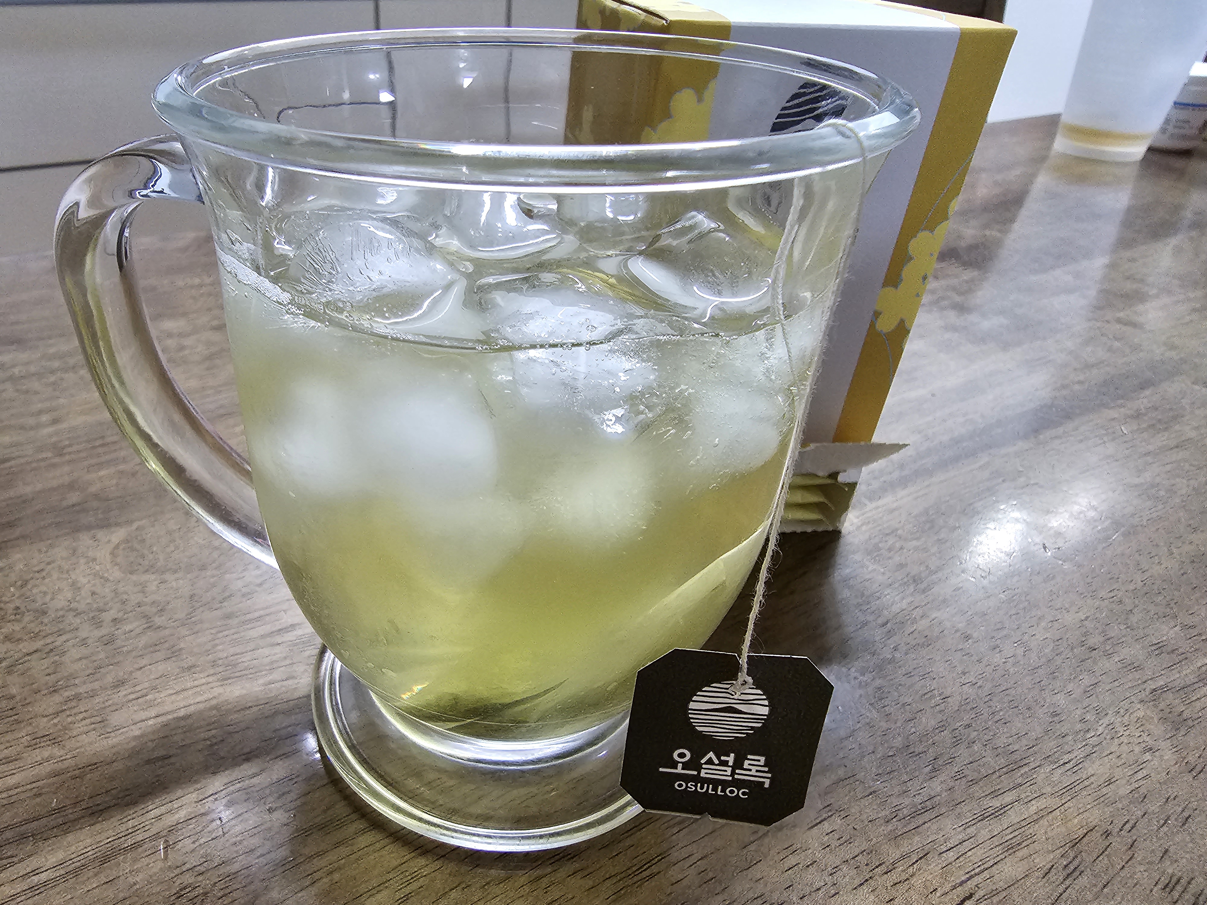 우려서 먹어봤습니다. 설명에는 150ml라고 하지만 저는 녹차를 항상 물 가득 우려서 얼음 넣고 먹기 때문에 제 멋대로 우려서 먹었습니다. 일단 향은 티백일 때는 강했지만 뜨거운 물에 들어가니 향이 강하지 않고 은은해진 느낌이었습니다. 달달한 향이 조금 나면서도 일반적인 녹차 티백 우리는 느낌이었어요.