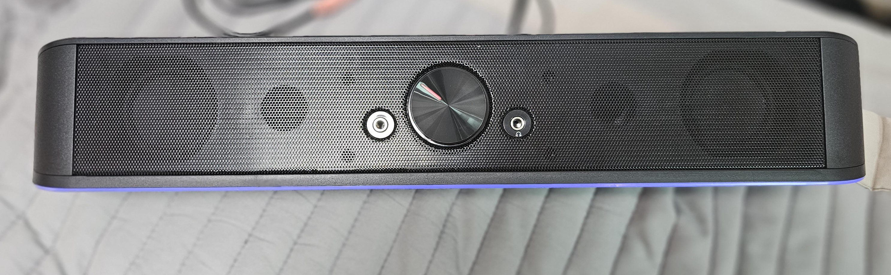 케이블은 usb와 마이크선, 스피커선이 잇습니다. 컴퓨터에 연결하고 볼륨을 키니 사운드바 하단의 라이트가 들어오고 윗부분을 터치하면 색상이 변하네요.