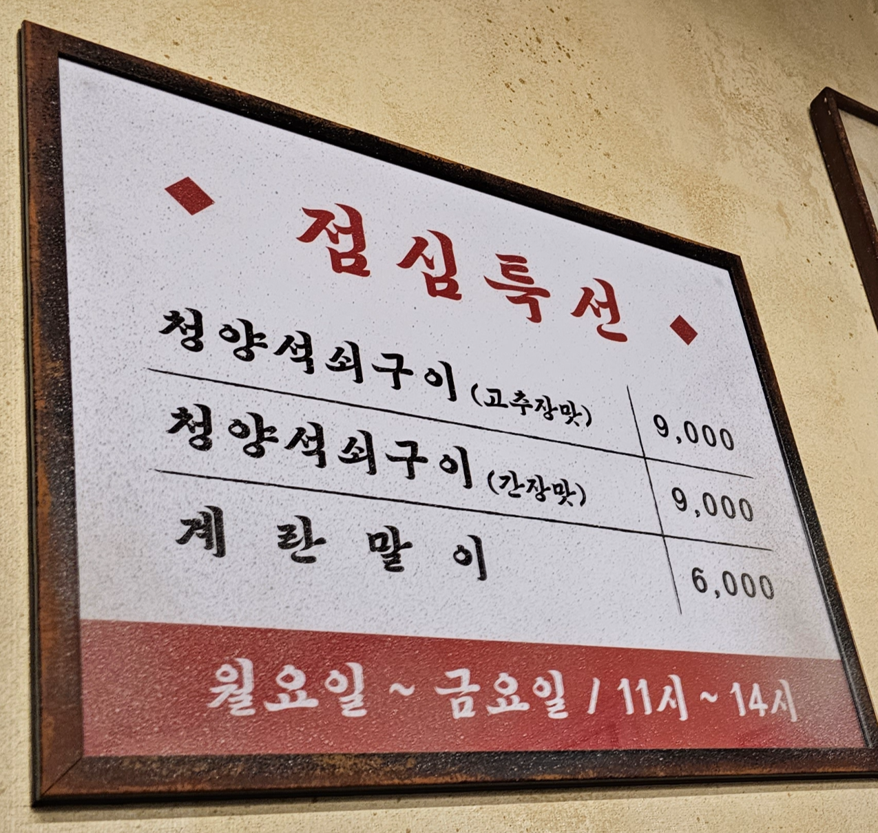 한쪽에는 점심 메뉴가 있습니다. 청양석쇠구이를 고추장맛과 간장맛으로 판매중이고 계란말이도 팔고 있네요.
