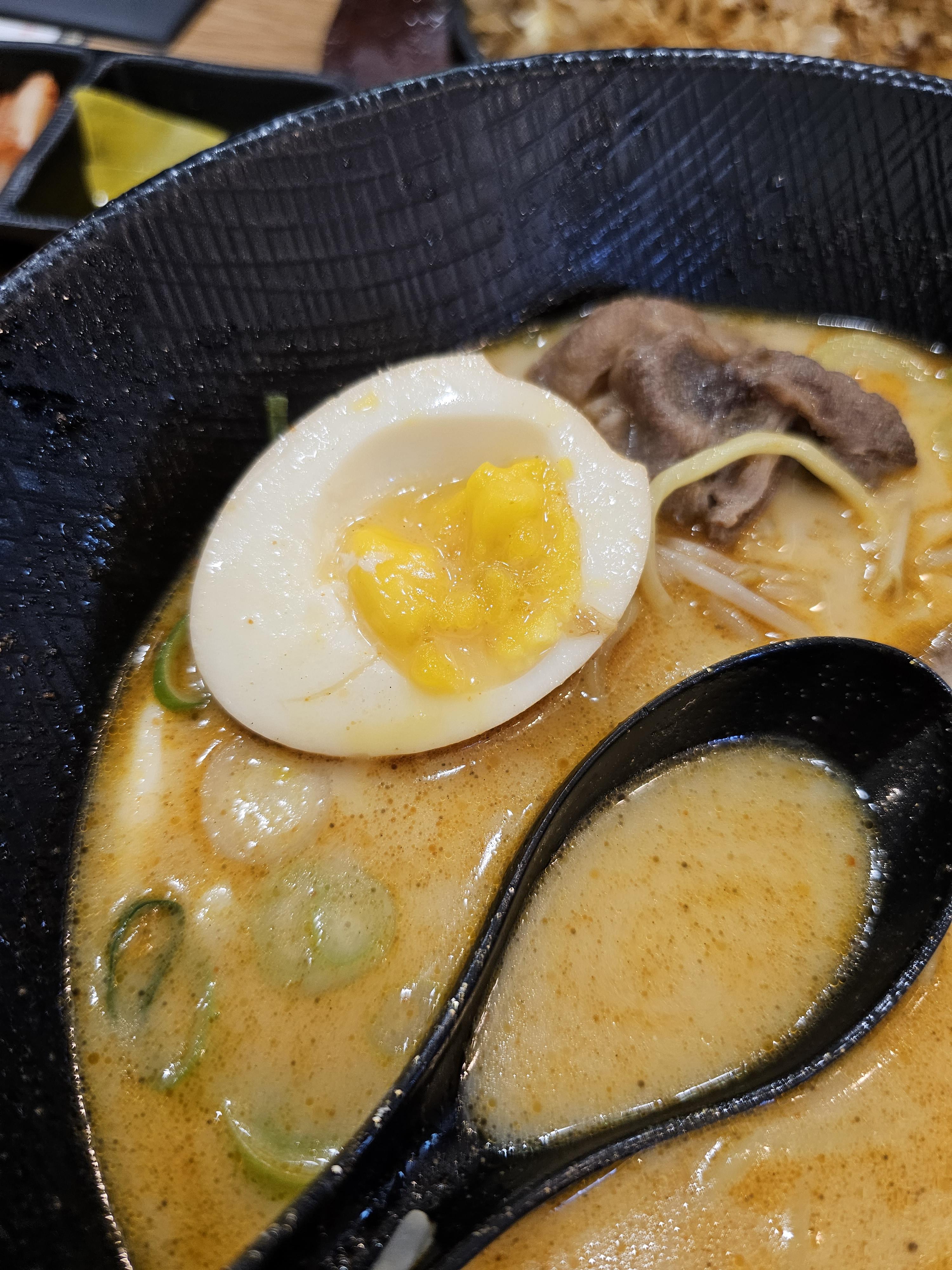 대만동 매운 라멘은 고기와 달걀, 숙주나물, 파 등등 라멘에 들어가는 토핑들이 들어가 있고, 맛도 약간 매콤한 돈코츠라멘 맛이었습니다. 개인적으론 고기가 부드럽고 엄청 맛있었어서 좋았습니다. 계란은 국물에 잠겨있어서 발견했을 땐 이미 노른자가 약간 흩어진 다음이었네요.