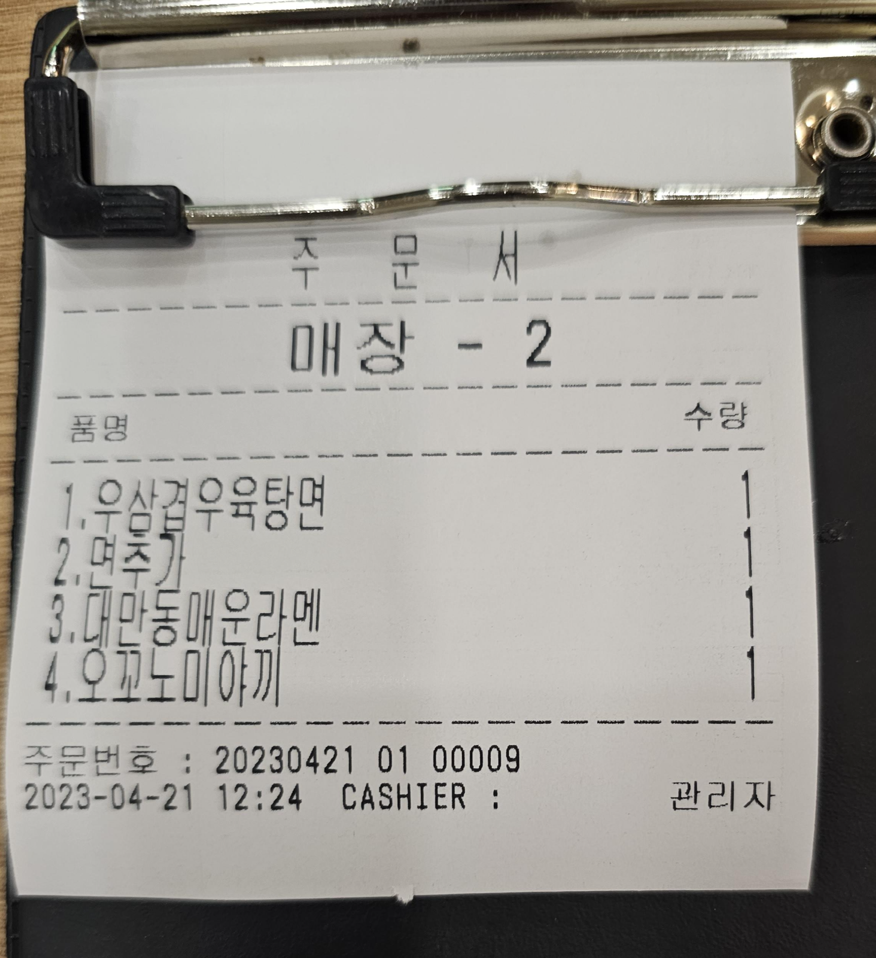 저희는 우삼겹우육탕면 면추가와 대만동매운라멘, 오꼬노미야끼를 주문했습니다. 고수나 고추 소스가 필요하면 직원에게 말하면 가져다준다고 하네요.