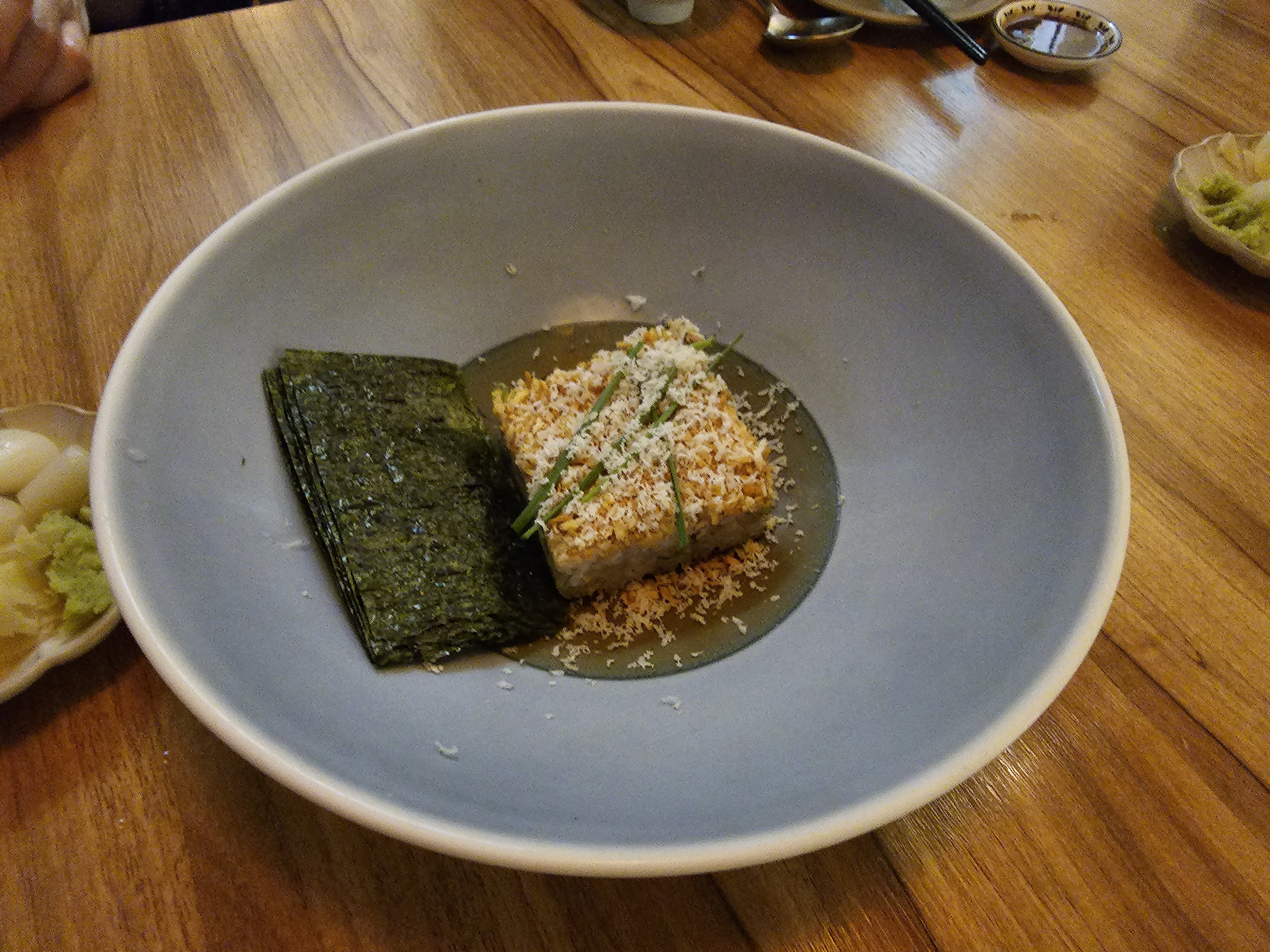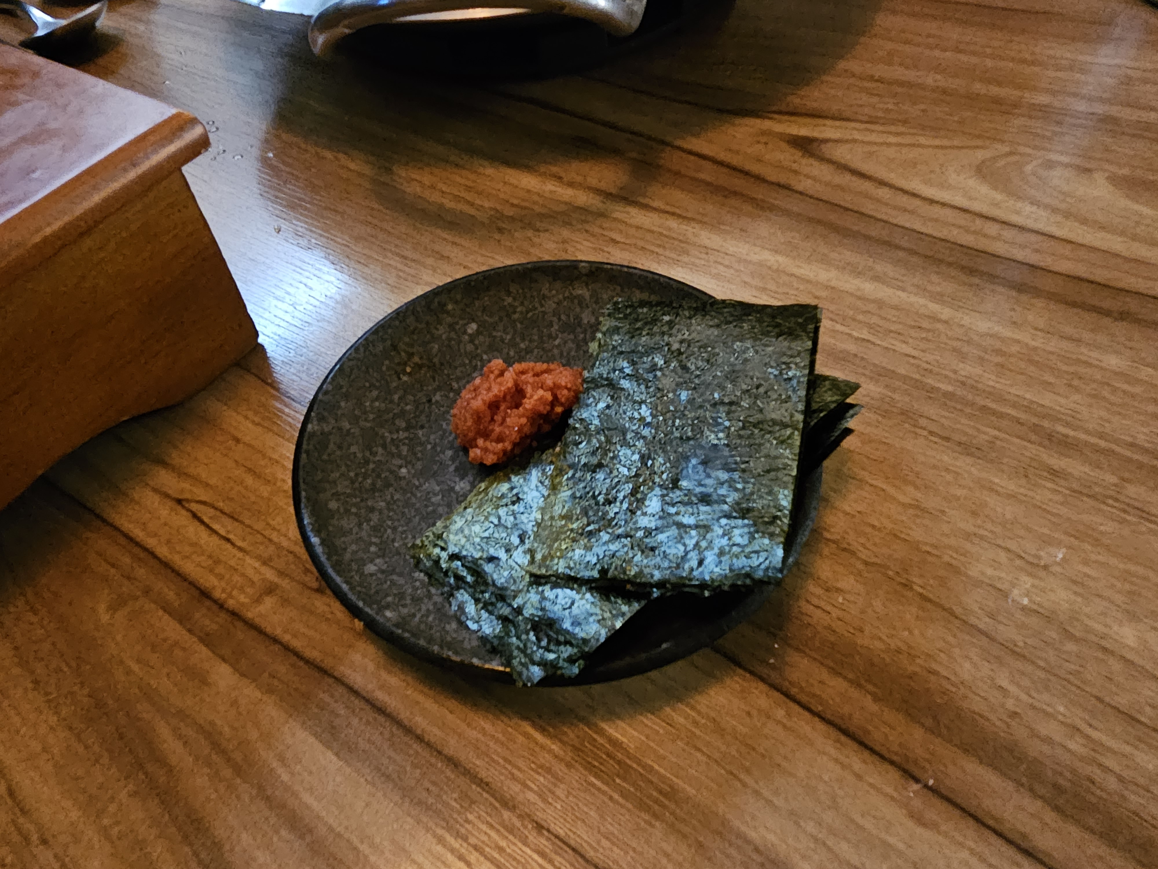 그다음 나온 건 명란 뭐 명태살 뭐 빵가루가 들어갔다는 음식입니다. 이름이 기억이 안 나는데 엄청 차갑게 나오는 음식이었습니다. 김이랑 싸 먹으라고 하는데 생각보다 단단해서 놀랐습니다. 맛은... 두부와 참치로 전을 해서 먹을 때와 비슷한 느낌의 맛이었습니다. 개인적으론 이날 음식 중에선 이 음식이 제 입맛엔 제일 안 맞은 것 같네요.