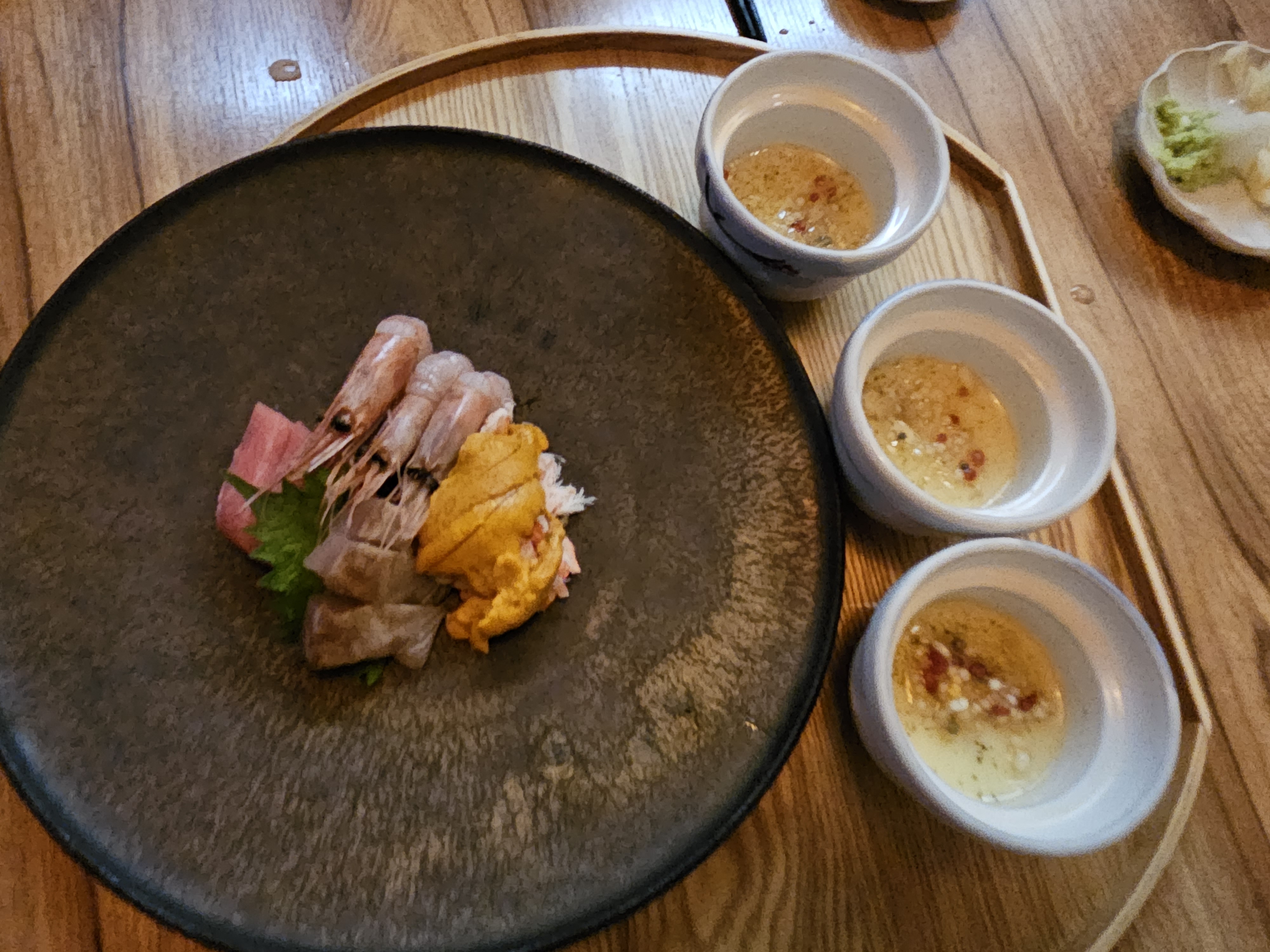 그다음은 우니가 올라간 게살과 단새우, 그리고 회가 두 종류가 나왔습니다. 그리고 차완무시(계란찜)가 함께 나왔습니다.