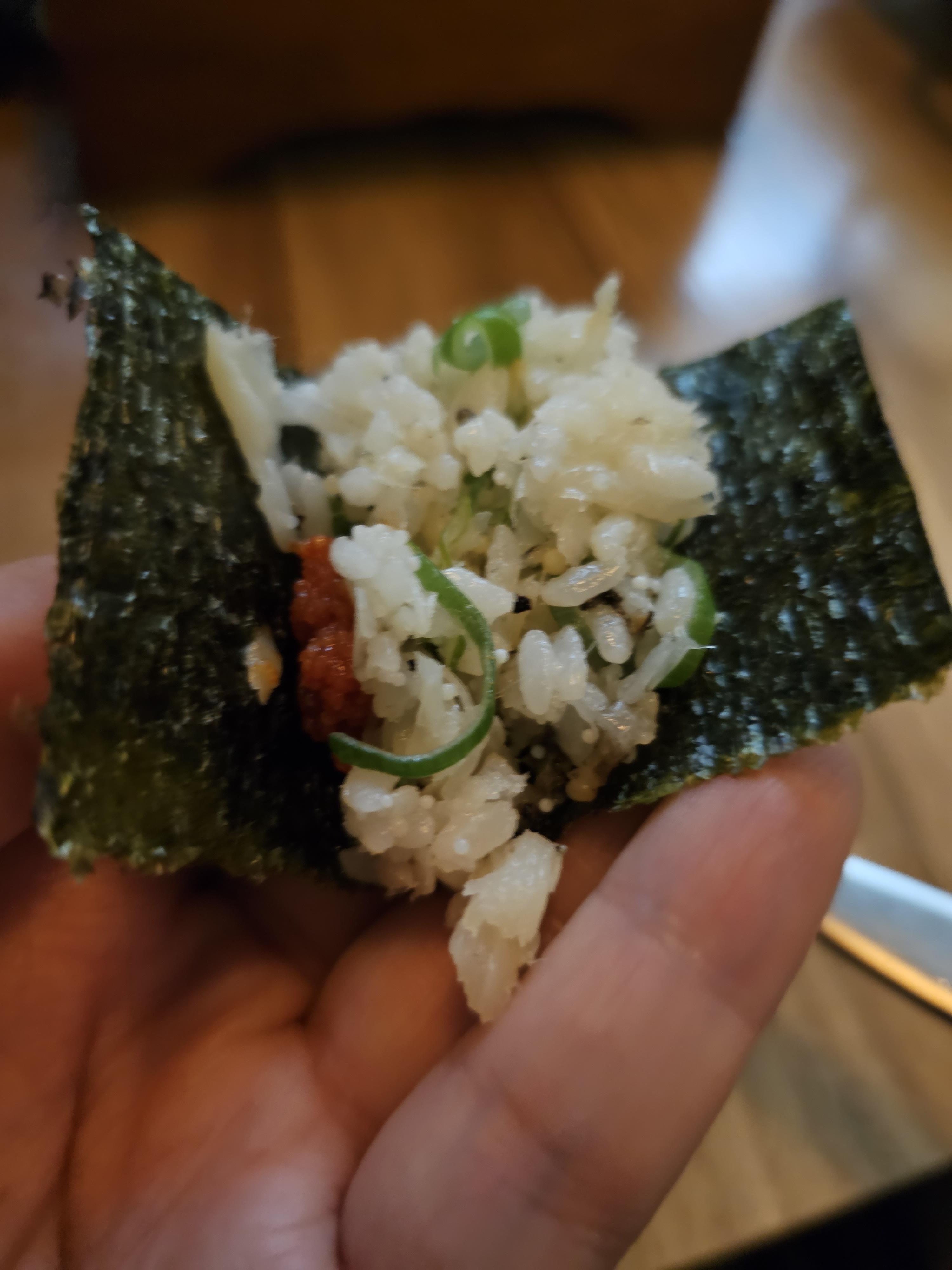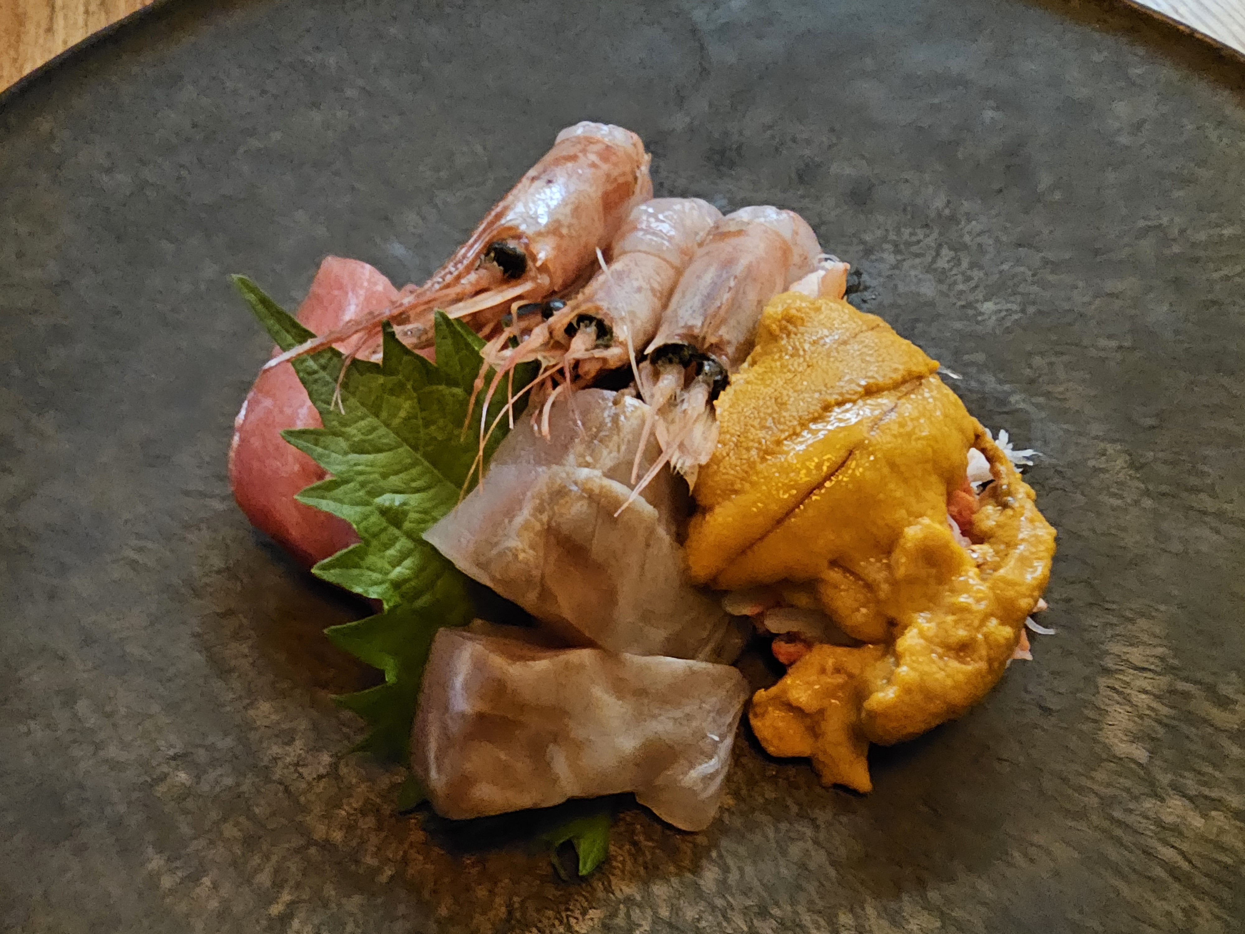 회는 어떤 건지 기억이 안 나는데 붉은 건 참치였던 것 같네요. 우니가 올라간 게살은 우니가 부드럽고 게살은 맛있었는데, 회는 무난하게 맛있었고, 단새우는 새우가 진짜 녹진하면서 달달해서 엄청 맛있었습니다.