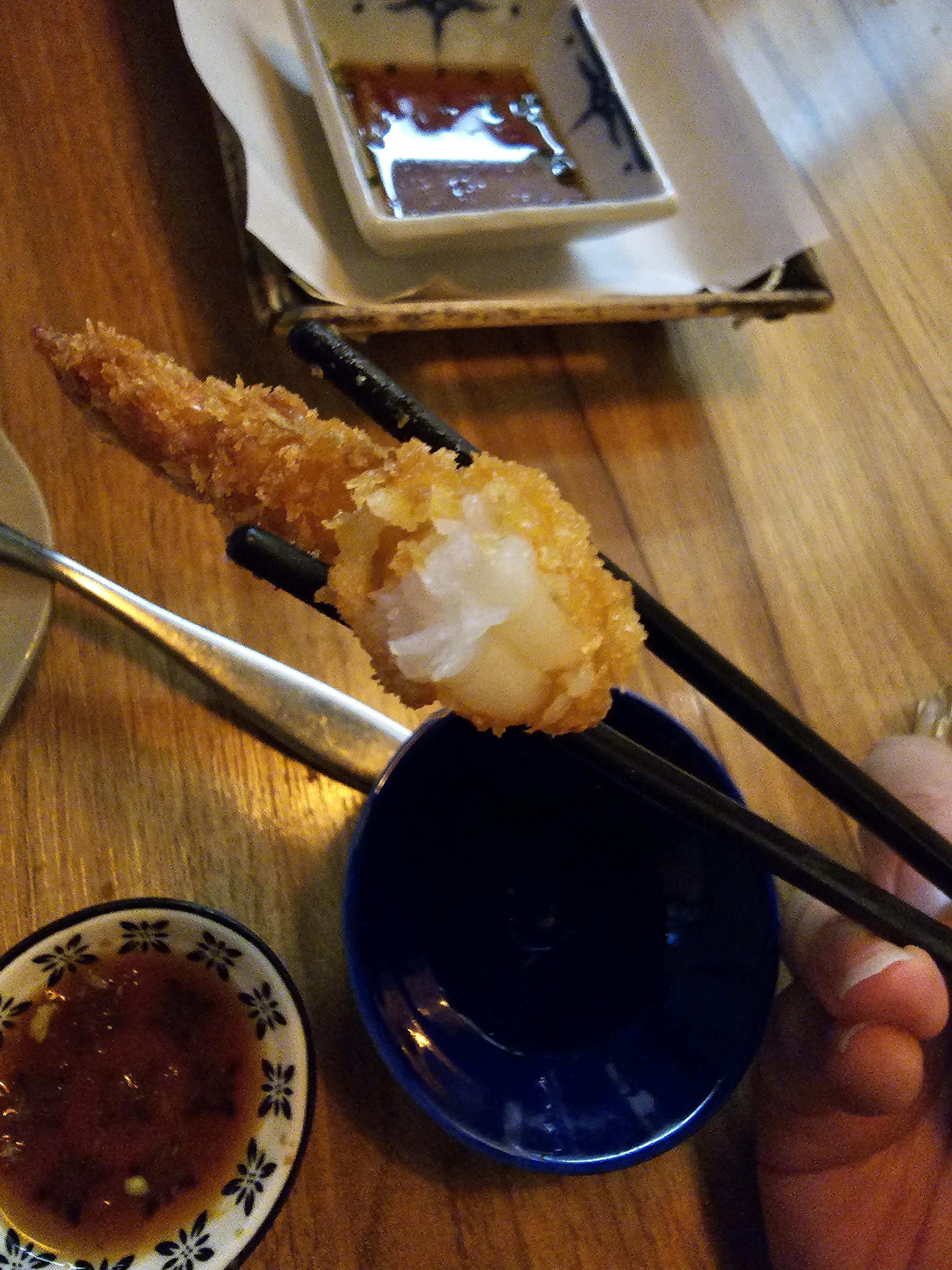 그다음은 가지와 새우튀김 그리고 매실청이 들어간 음료가 나왔습니다. 매실 음료는 시원하고 달달해서 좋았고, 가지튀김은 그냥저냥... 가지튀김하면 제일 먼저 생각나는 양꼬치 집 가지 튀김보다는 별로였습니다. 새우튀김은 새우가 꽤 큼직해서 맛있게 먹었습니다.