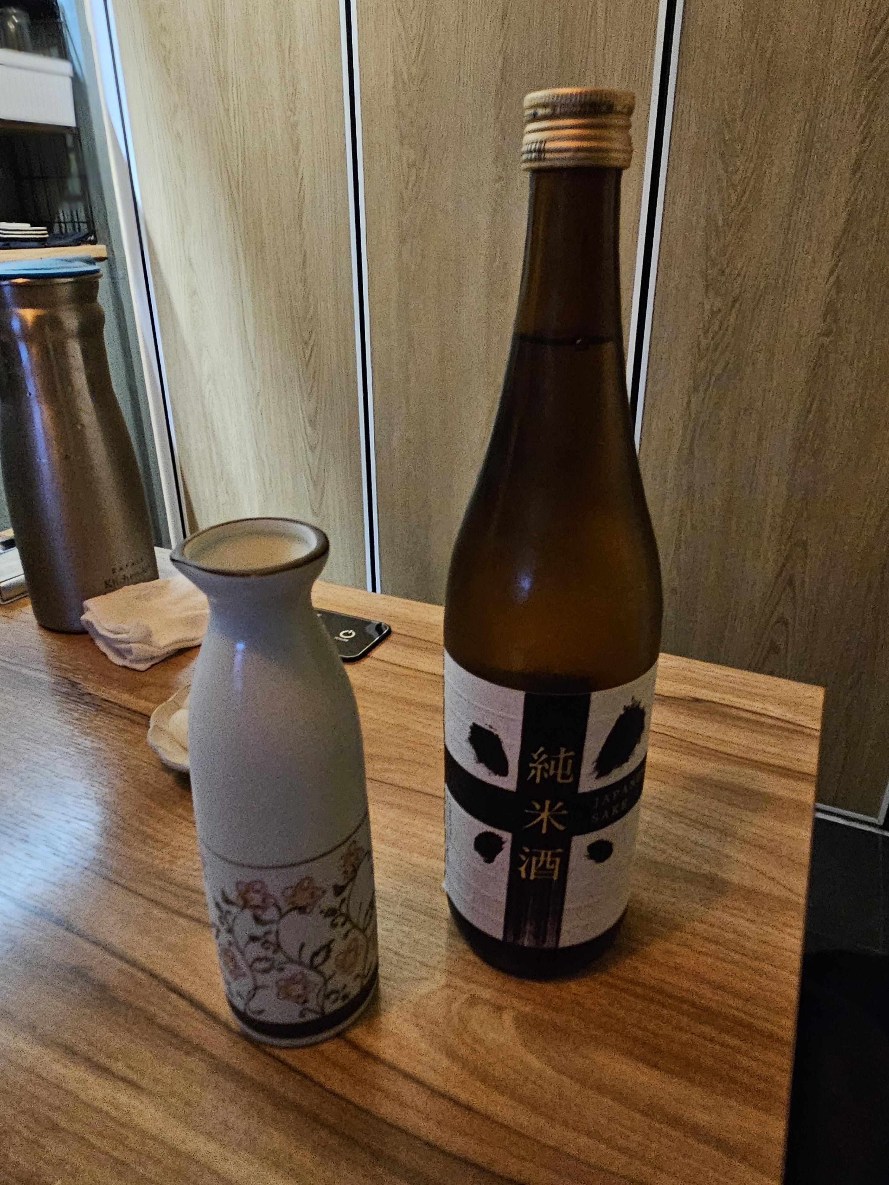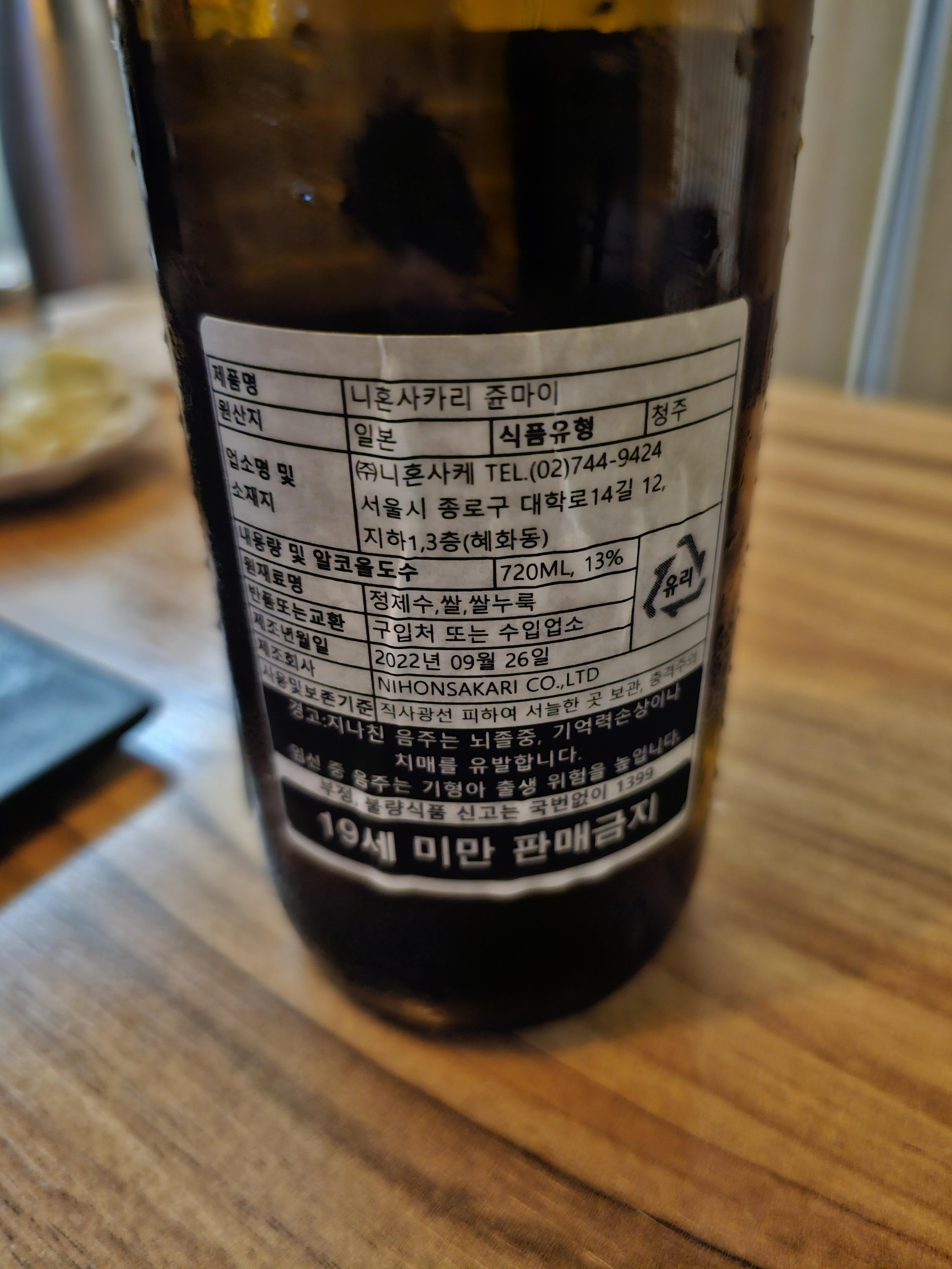 알코올도수가 13도고 쌀로 만들어서 그런지 사케를 별로 안 좋아하는 저에게도 향이 강하지 않고 부드러워서 맛있게 마셨습니다. 주문하면 도쿠리 한 병을 가져다주기 때문에 술을 조금씩 따라놨다가 잔에 따라서 먹었습니다. 얼음 바스켓이라도 하나 있었으면 끝까지 차갑게 마셨을 텐데 그 점은 약간 아쉬웠습니다.