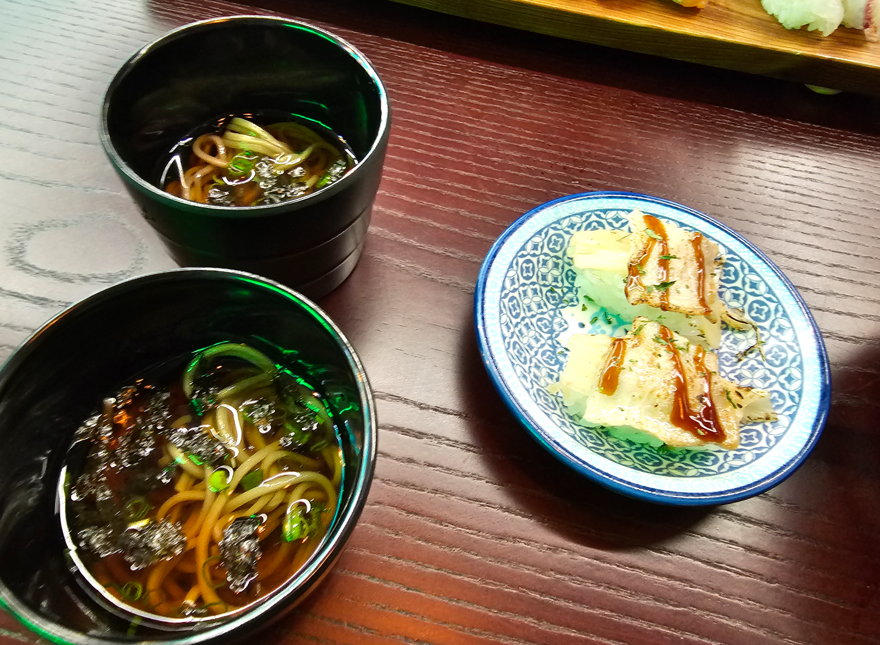 그다음에는 미니 모밀과 초밥을 서비스로 주셨습니다.