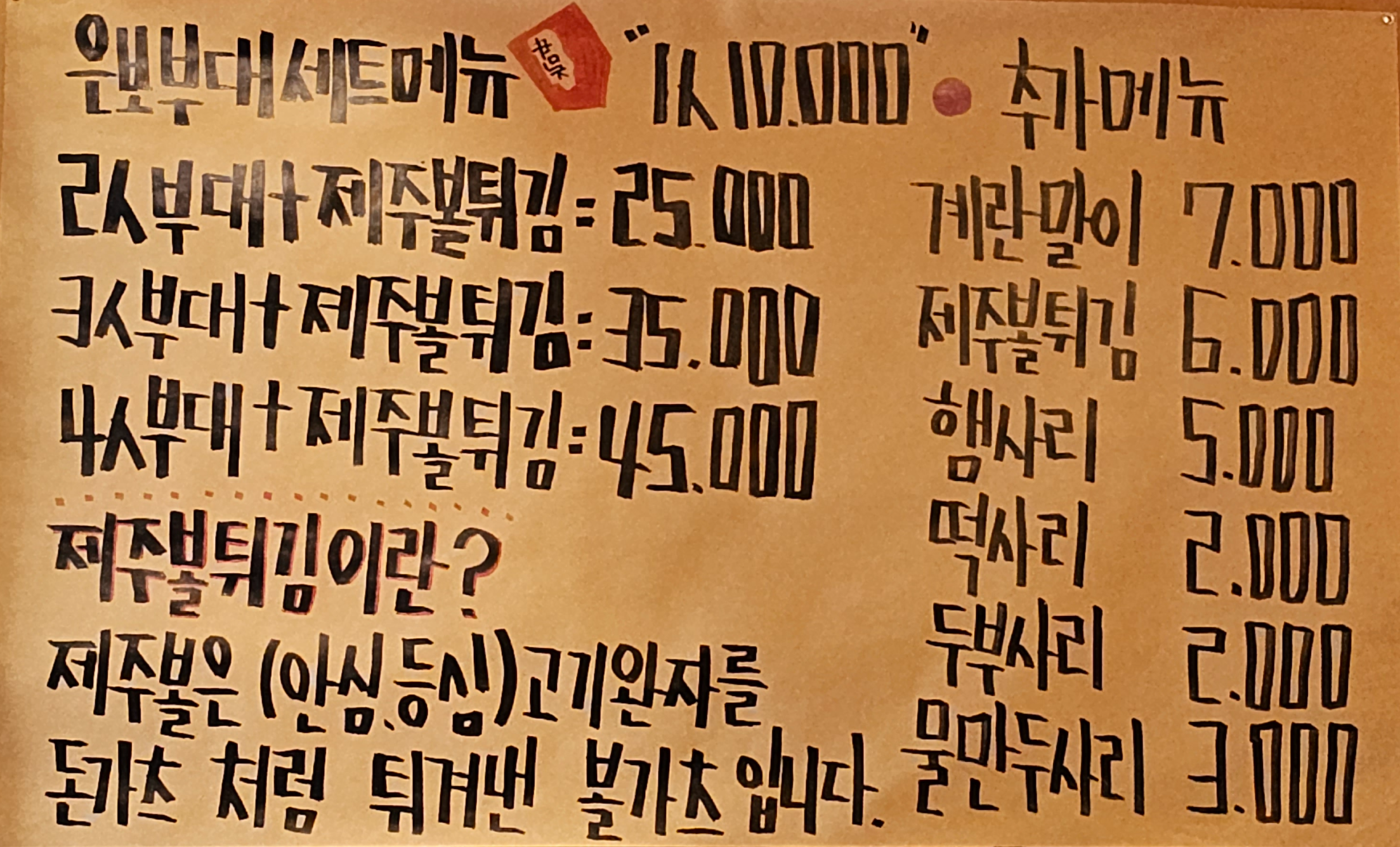 메뉴는 부대찌개와 추가메뉴를 팔고 있고, 제주볼튀김과 부대찌개를 함께 파는 세트메뉴도 잇습니다.