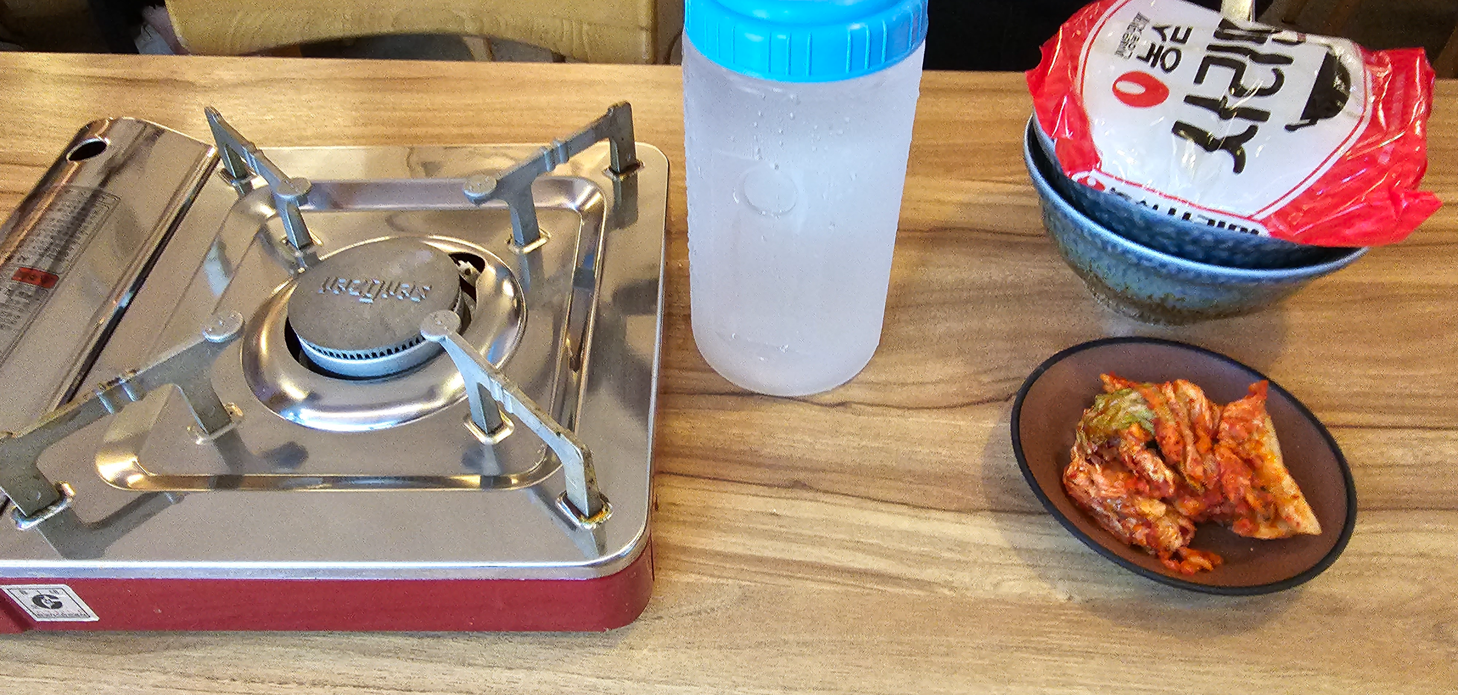 테이블에는 가스버너와 물, 김치, 라면사리 1개와 육수가 미리 세팅이 되어있었습니다.