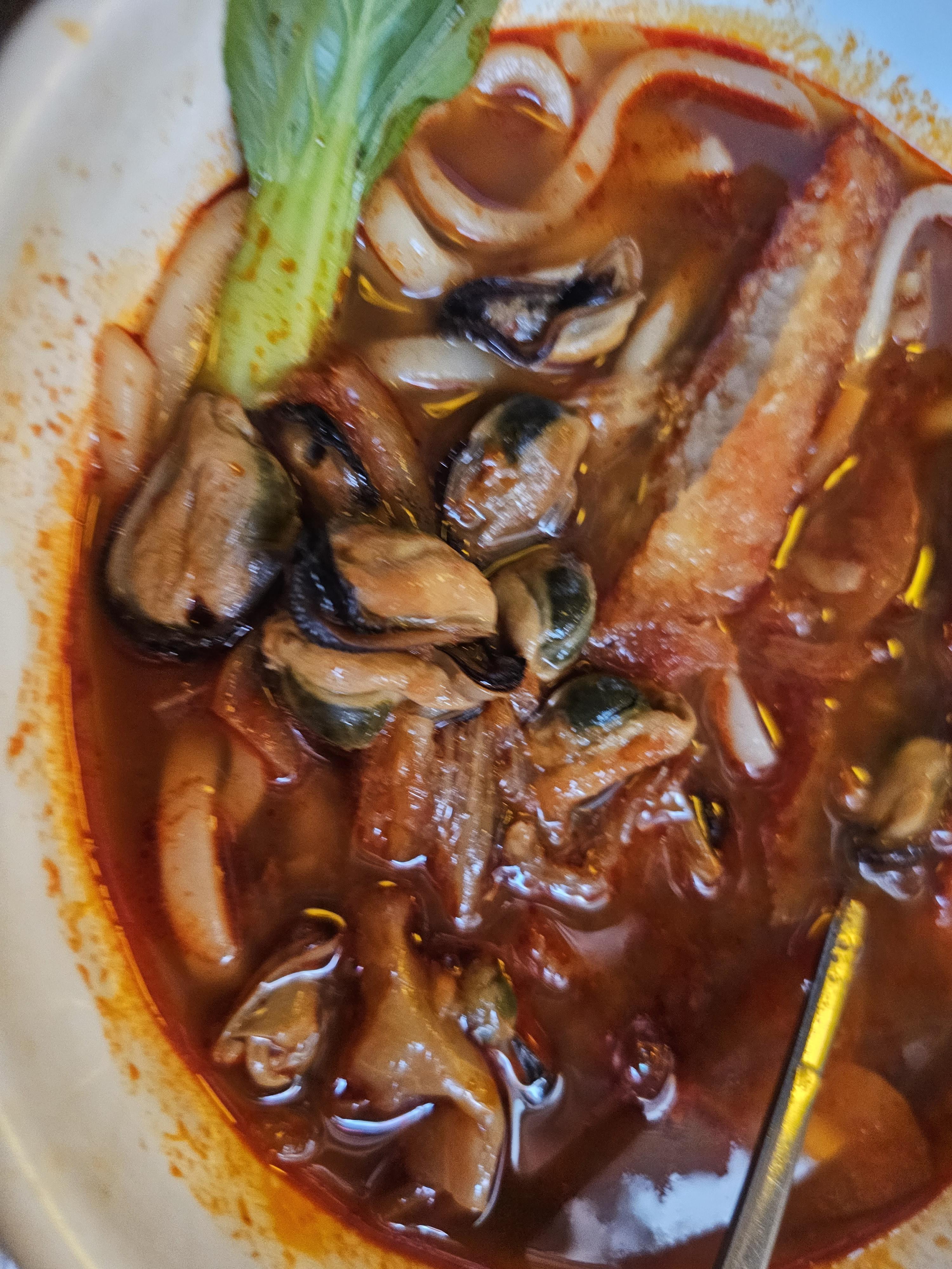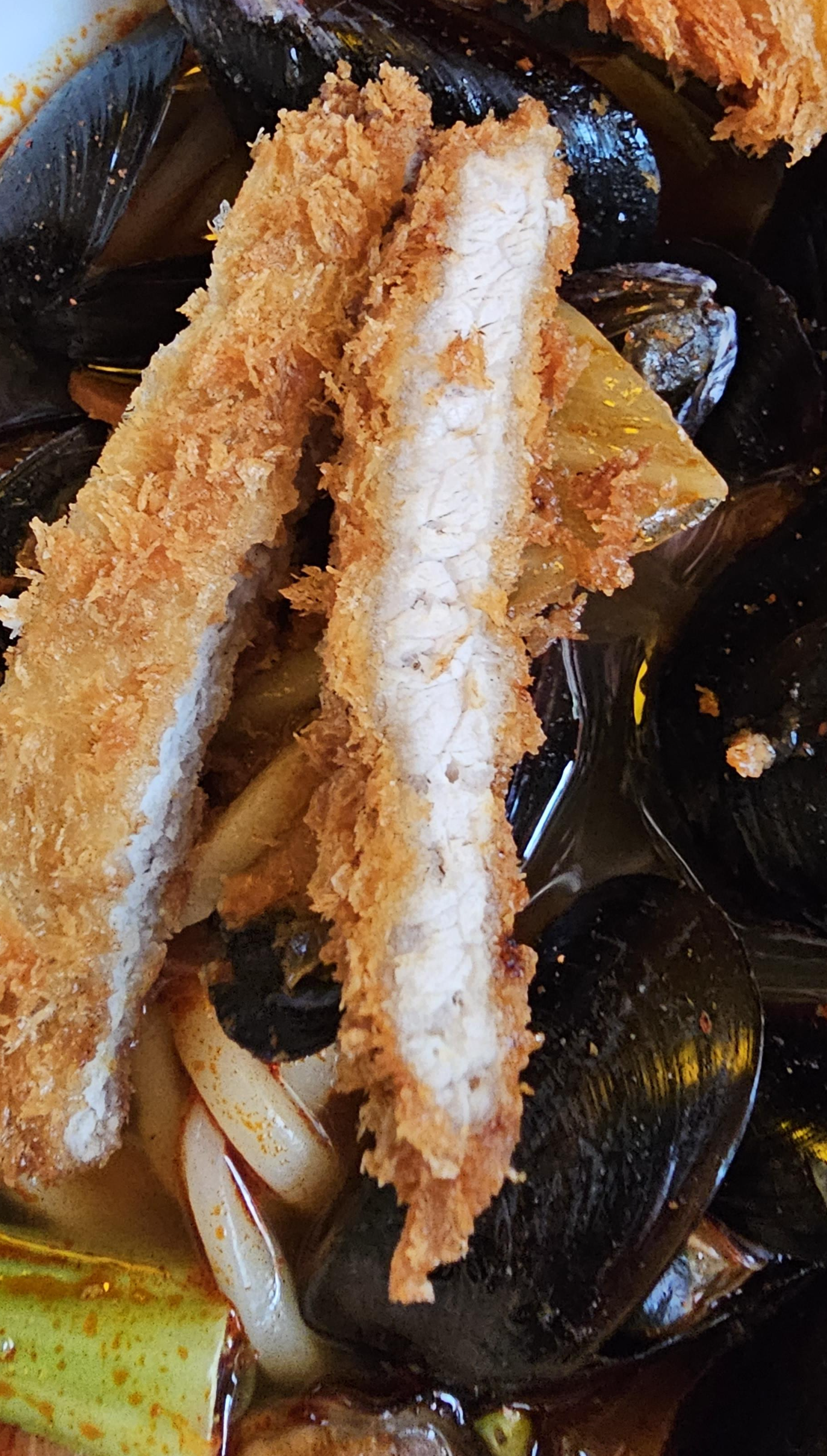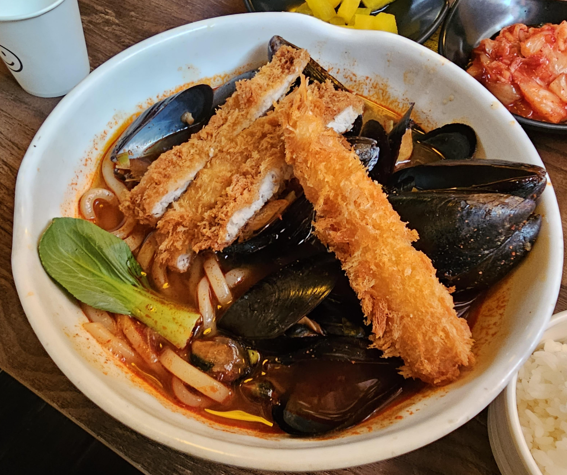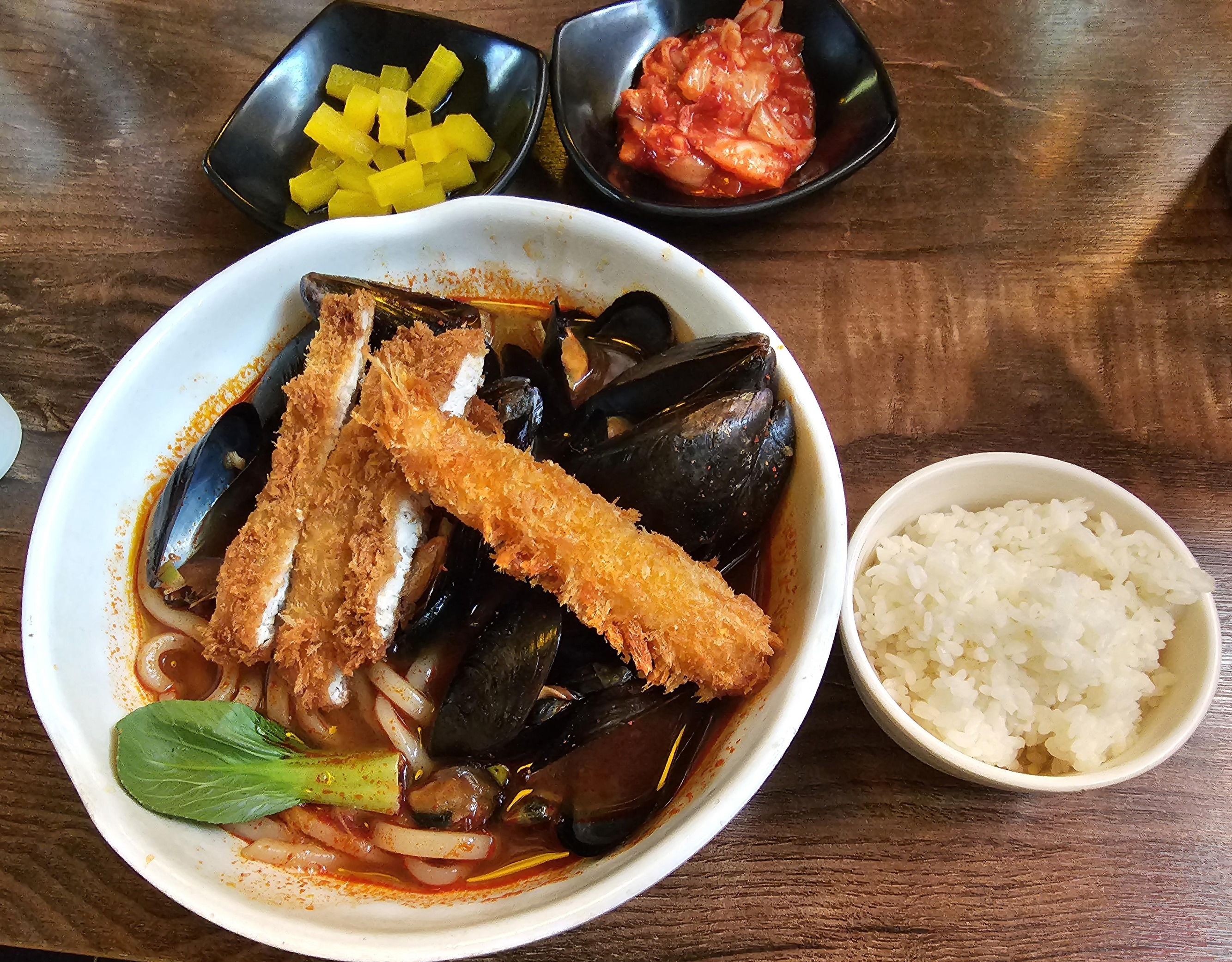 홍합짬뽕돈가스는 밥과 함께 나왔는데, 일단 위에 올라간 돈까스 3조각과 새우튀김이 눈에 띄었습니다. 메뉴판에는 짬뽕탕과 돈까스 라고 해서 짬뽕 위에 돈가스가 올라가거나 따로 돈까스가 나오는 형태일 거라 예상은 했는데 새우튀김도 나오네요. 청경채는 데코용인지 딱 한 개가 들어있었습니다.