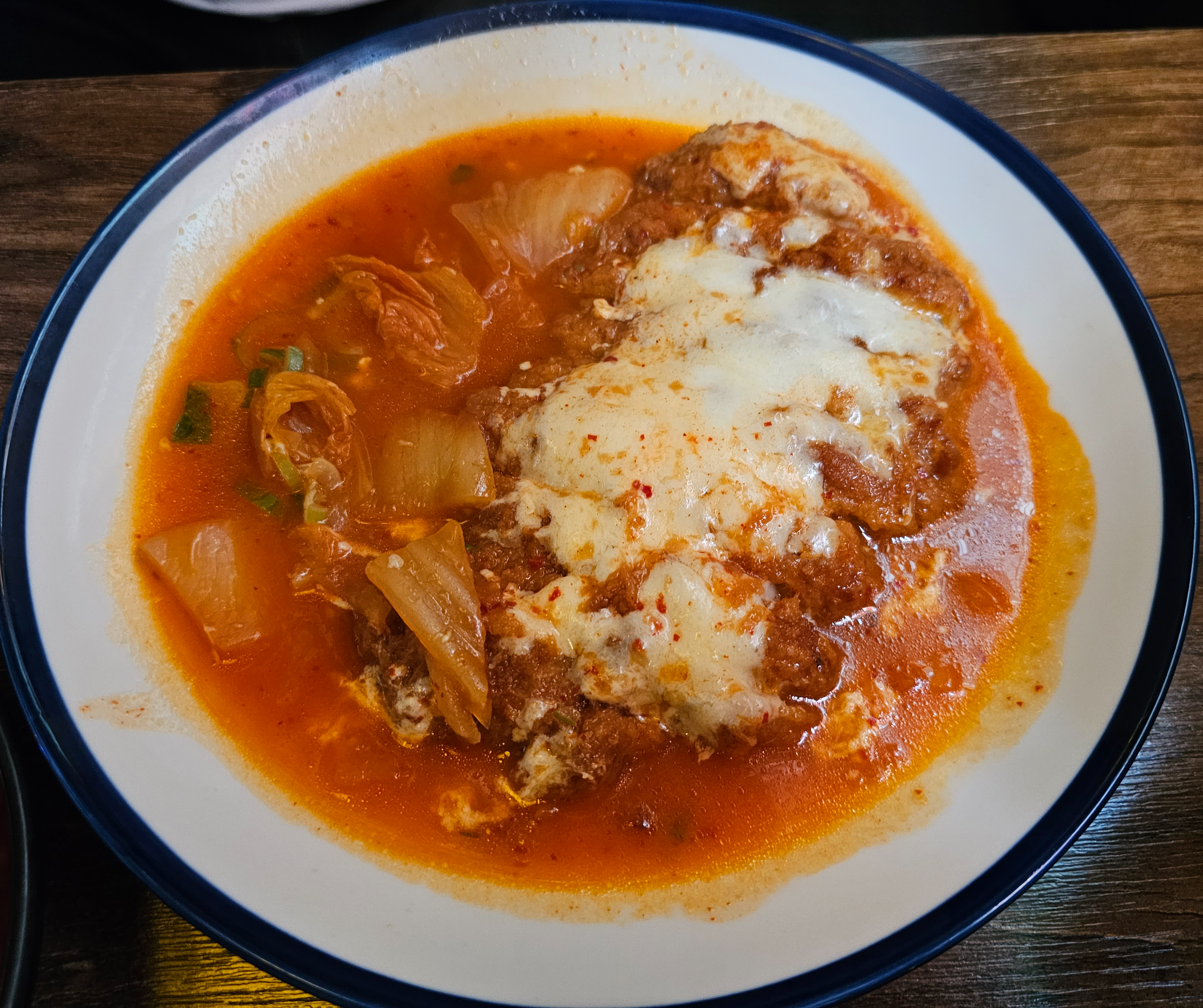 김치나베돈까스는 일단 외관은 그닥 맛있어 보이지는 않았습니다. 다른 식당에서 먹었을때를 생각하면 보통 뚝배기 같은데 나오는걸로 아는데 여기는 일반 접시에 뭔가 김치찌개와 돈까스를 함께 넣고 위에 치즈를 뿌린 느낌이네요.