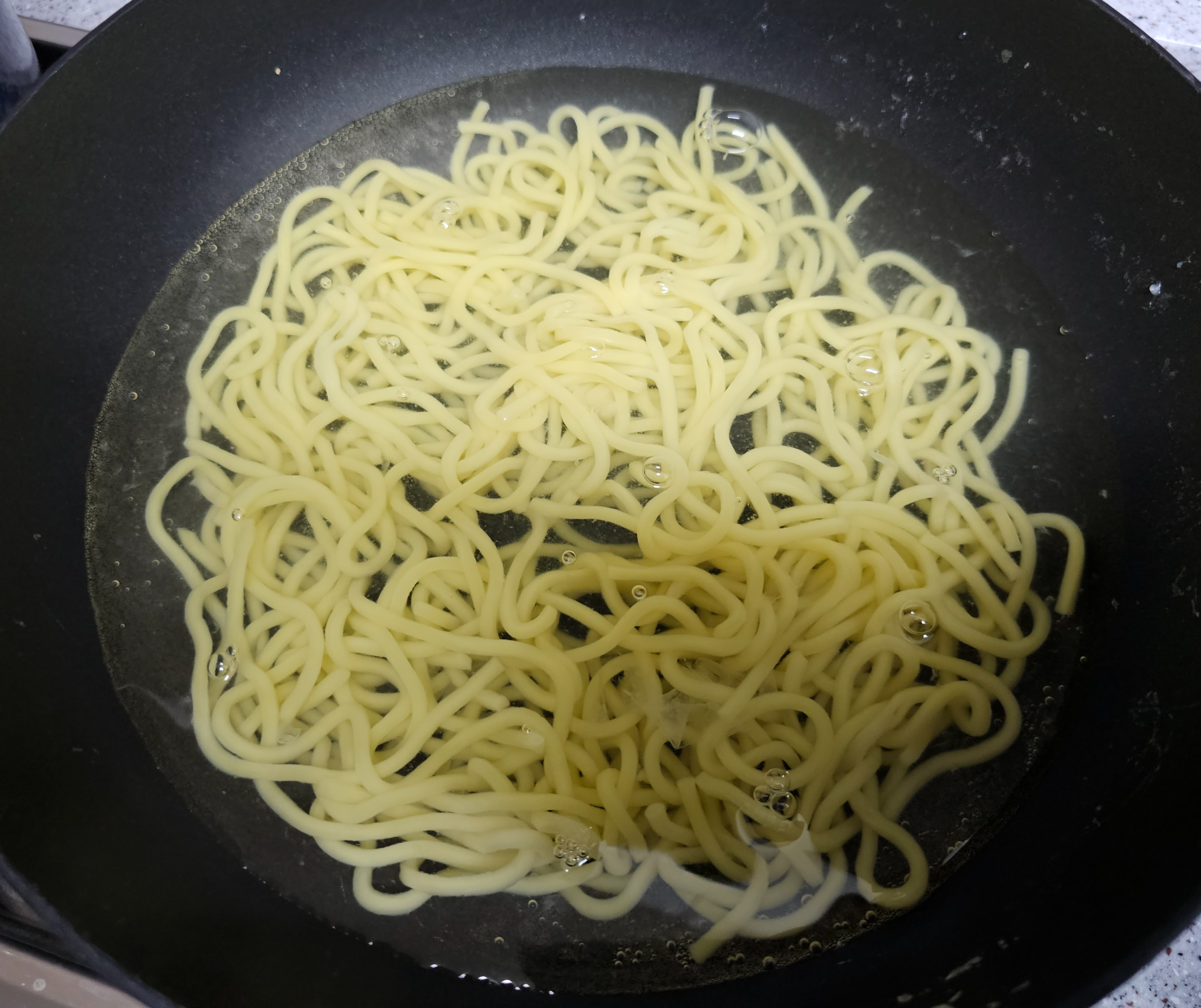 조리방법대로 면을 1분 삶고 양배추와 베이컨을 기름에 볶아주고 면과 같이 볶다가 소스를 넣고 마저 볶아서 만들었습니다. 냉동보관이라 양배추가 수분기? 얼음? 등이 많아서 기름에 볶을 때 엄청 기름이 튀기더군요. 기름 튀기는 점 빼고는 만들면서 불편한 점 없이 후다닥 만들 수 있었습니다.