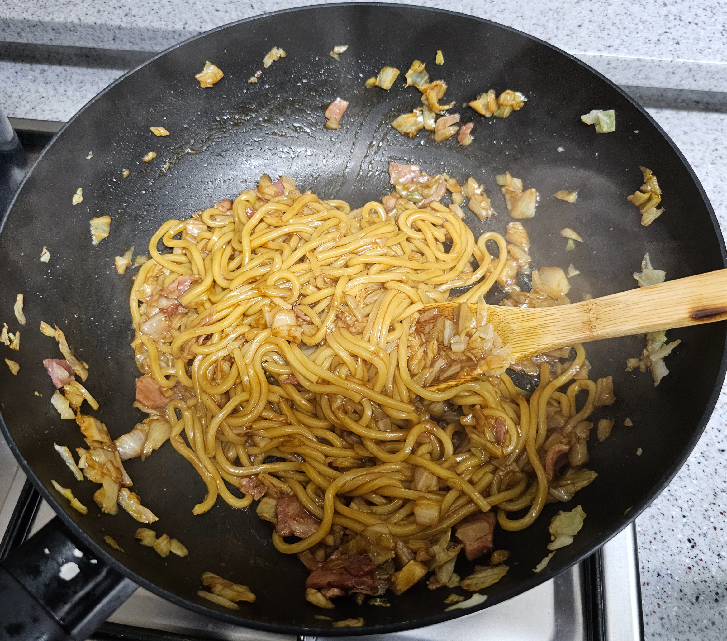 맛은 꽤 간이 쌘 느낌이었습니다. 베이컨과 양배추가 들어가니 확실히 평소에 볶아 먹을 때보다는 야끼소바라는 느낌이 강했습니다.
