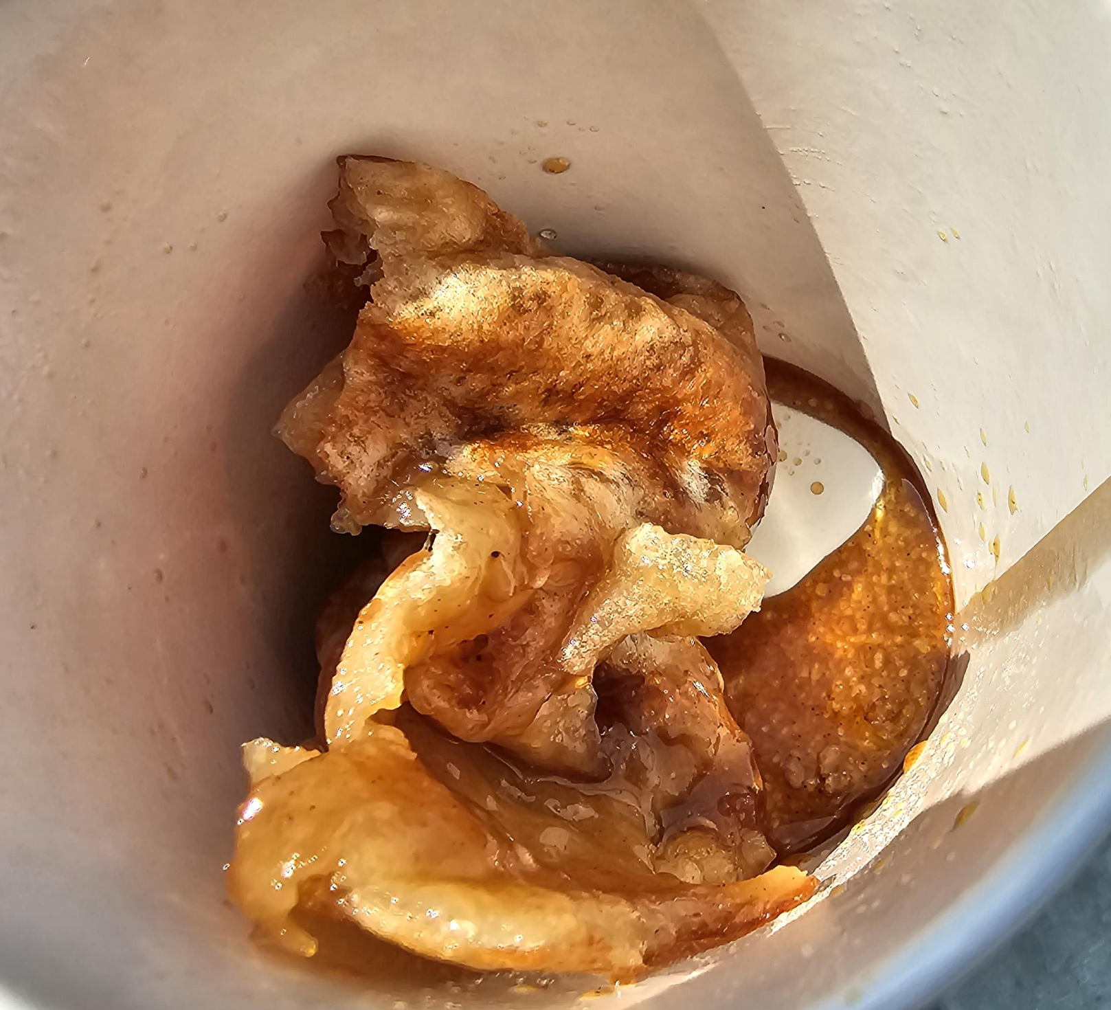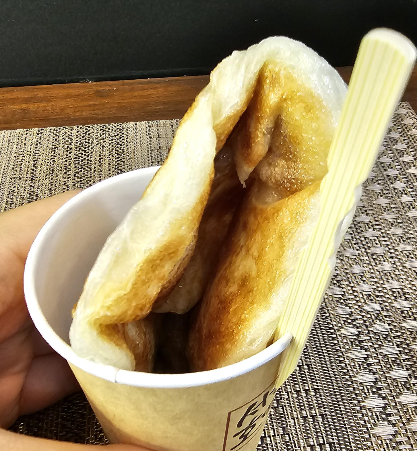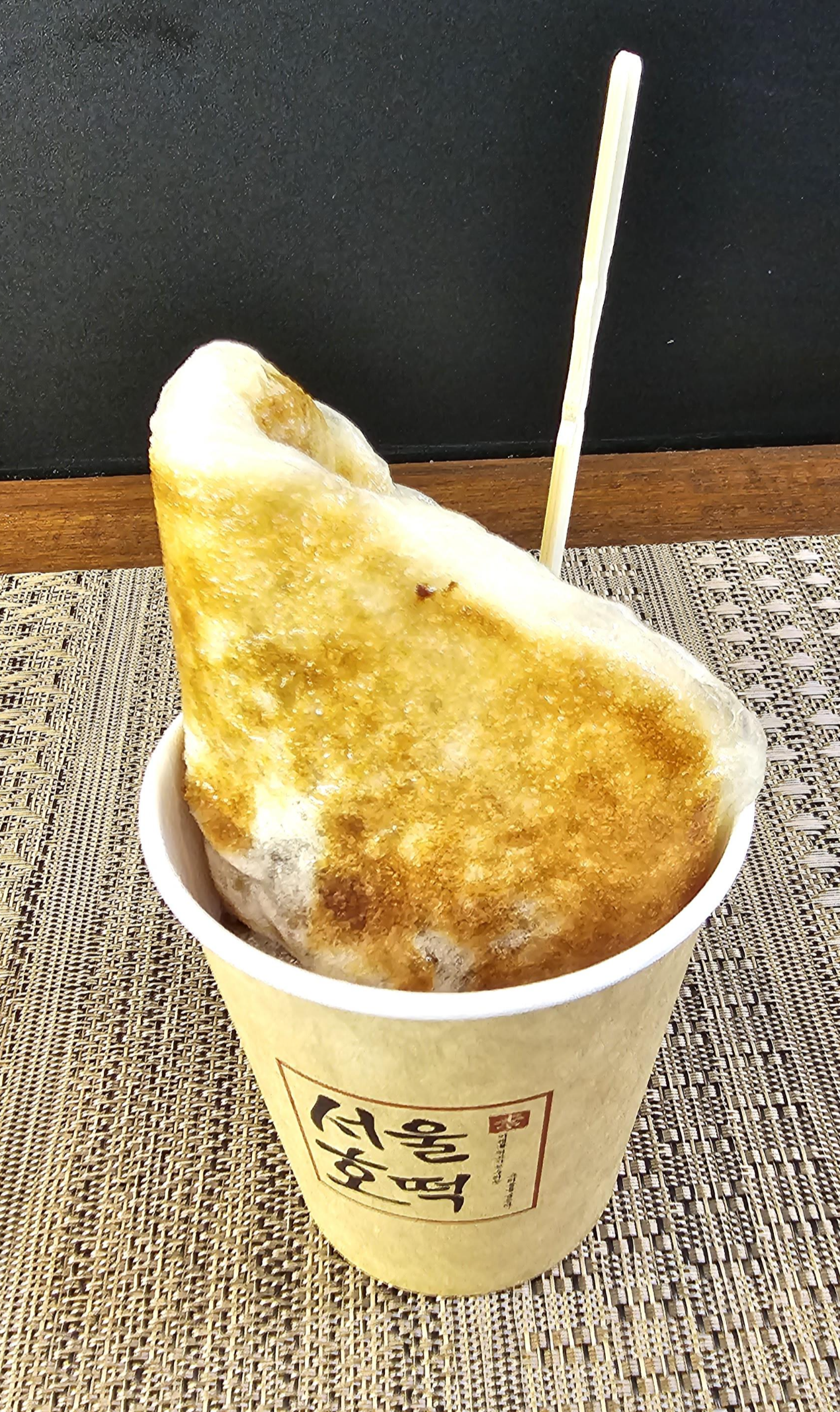 서울호떡 종이컵에 호떡이 담겨서 나왔습니다. 오랜만에 먹는 호떡이네요. 나무 포크를 같이 주기 때문에 설탕이 손에 떨어지거나 하는 일도 없고 먹기도 편해서 좋았습니다. 안에는 갈색의 설탕? 시럽이 들어가 있었고 약간의 깨가 섞여있었습니다. 계피향이나 맛도 적당해서 예전에 호떡 먹던 기억이 나네요.