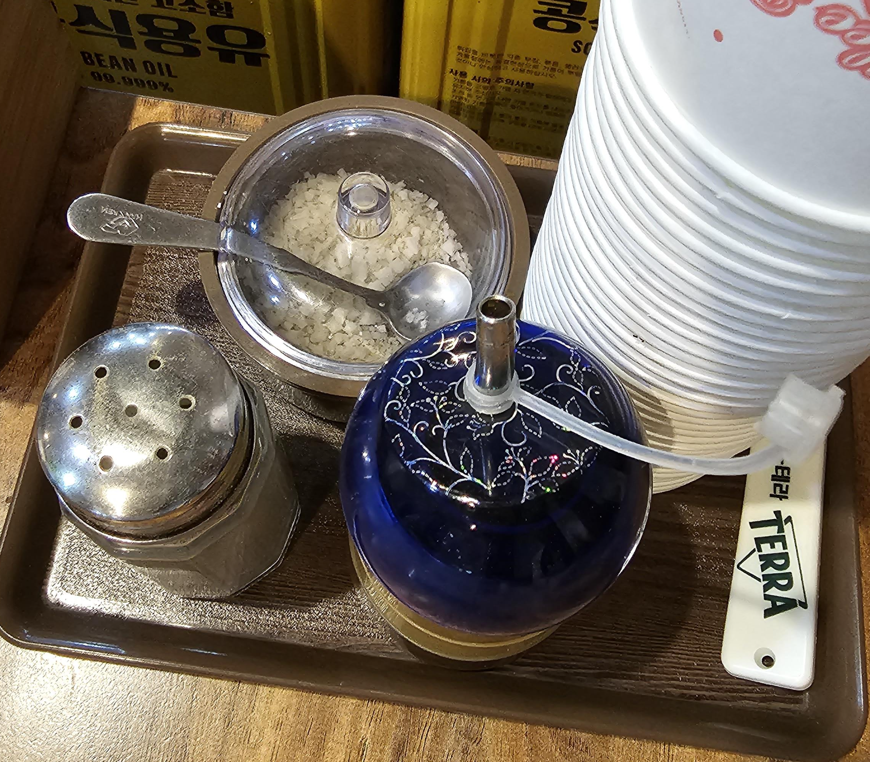 테이블에는 후추와 소금, 소스가 있습니다.