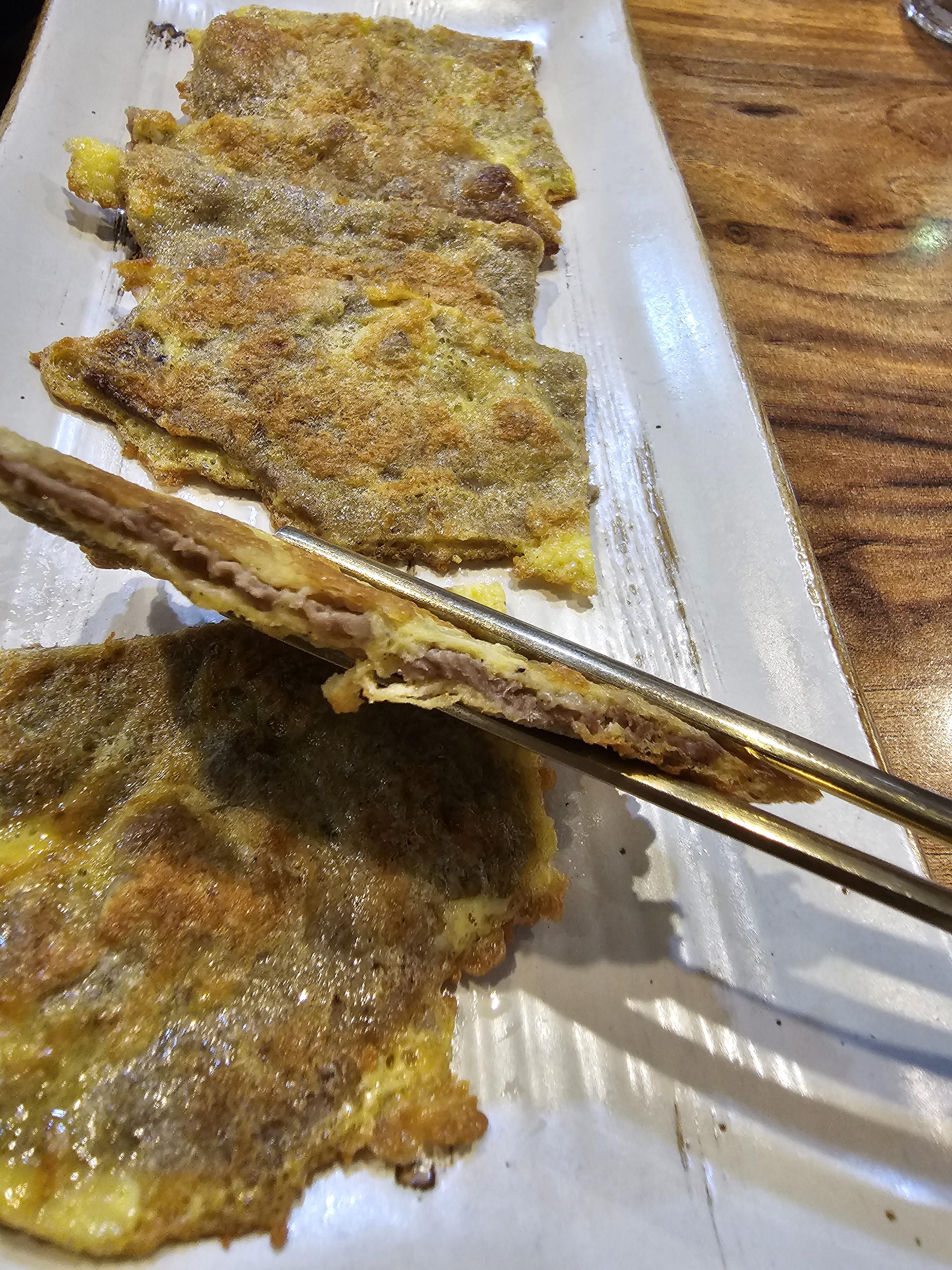 육전은 6조각이었는데 얇은 소고기에 겉에 반죽도 얇아서 고기맛이 잘 느껴지고 따끈할 때 먹으니 질기지도 않고 맛있었습니다. 반찬으로 나온 양파장아찌랑 같이 먹으라고 하셨는데 양파장아찌가 짠 편이 아니라 따로 양념장이 있었다면 더 좋았을 것 같네요. 식으면 맛이 확 떨어지기 때문에 식기 전에 먹는 게 좋을 것 같습니다.