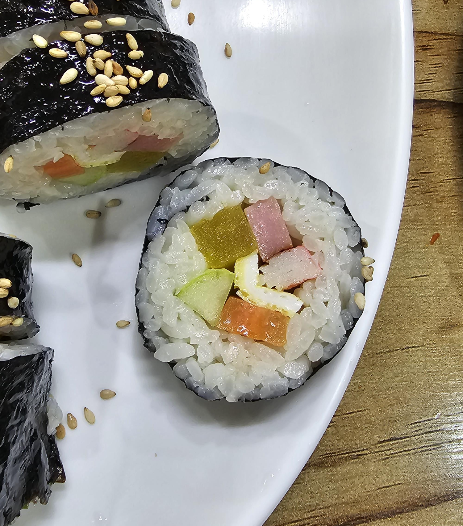 김밥은 밥을 밥솥에서 바로 퍼서 만들어서 밥알이 따끈했습니다. 안에 재료는 다른 식당보다 약간 빈약해 보였는데 시금치 같은 게 안 들어가서 어릴 때 야채 안 먹는 어린이용으로 만드는 김밥 같은 느낌이었습니다. 김도 안 눅눅했고 맛있었지만 속재료가 3,500원은 조금 아쉬운 느낌이네요. 그래도 비빔칼국수 양념과 잘 어울려서 칼국수를 먹으며 한 개씩 먹기 좋았습니다.다음에는 닭칼국수를 먹어보려 와바야겟습니다.