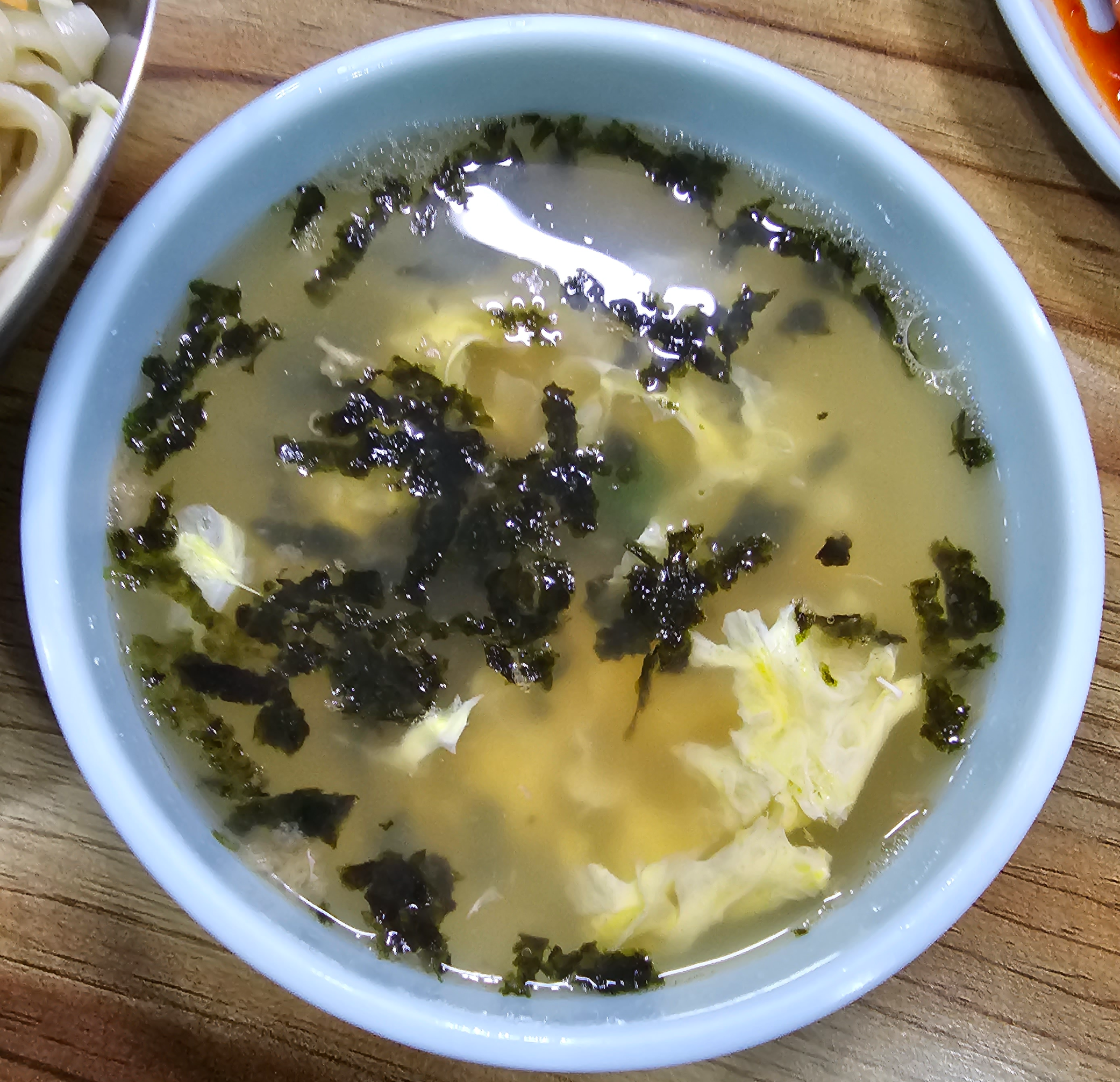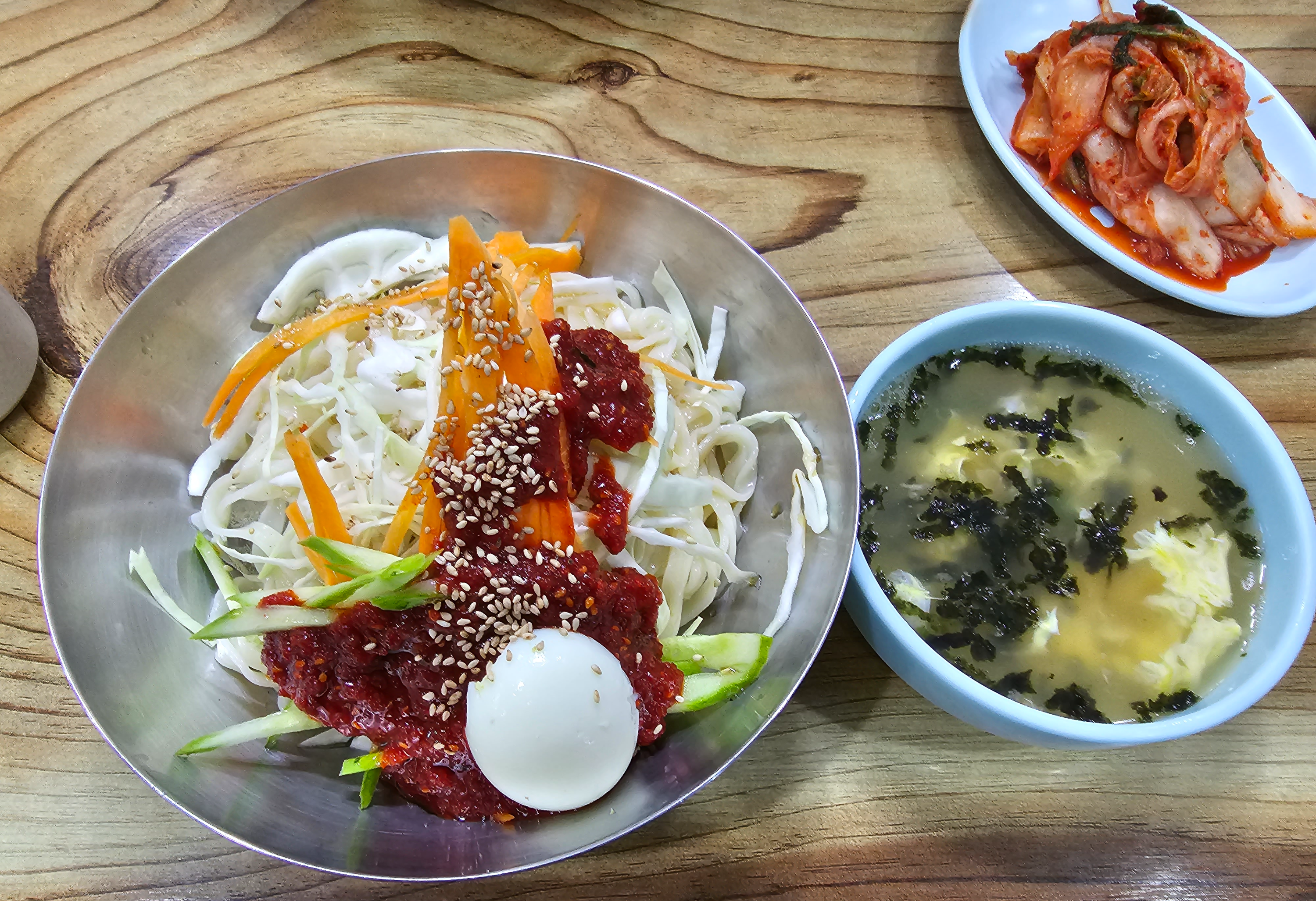 당근등의 야채는 생야채였습니다. 계란국물은 적당히 짭짤해서 비빔칼국수와 잘 어울렸습니다. 이미 간이 강한 칼국수라 그런지 김치와는 잘 어울리지는 않았습니다.