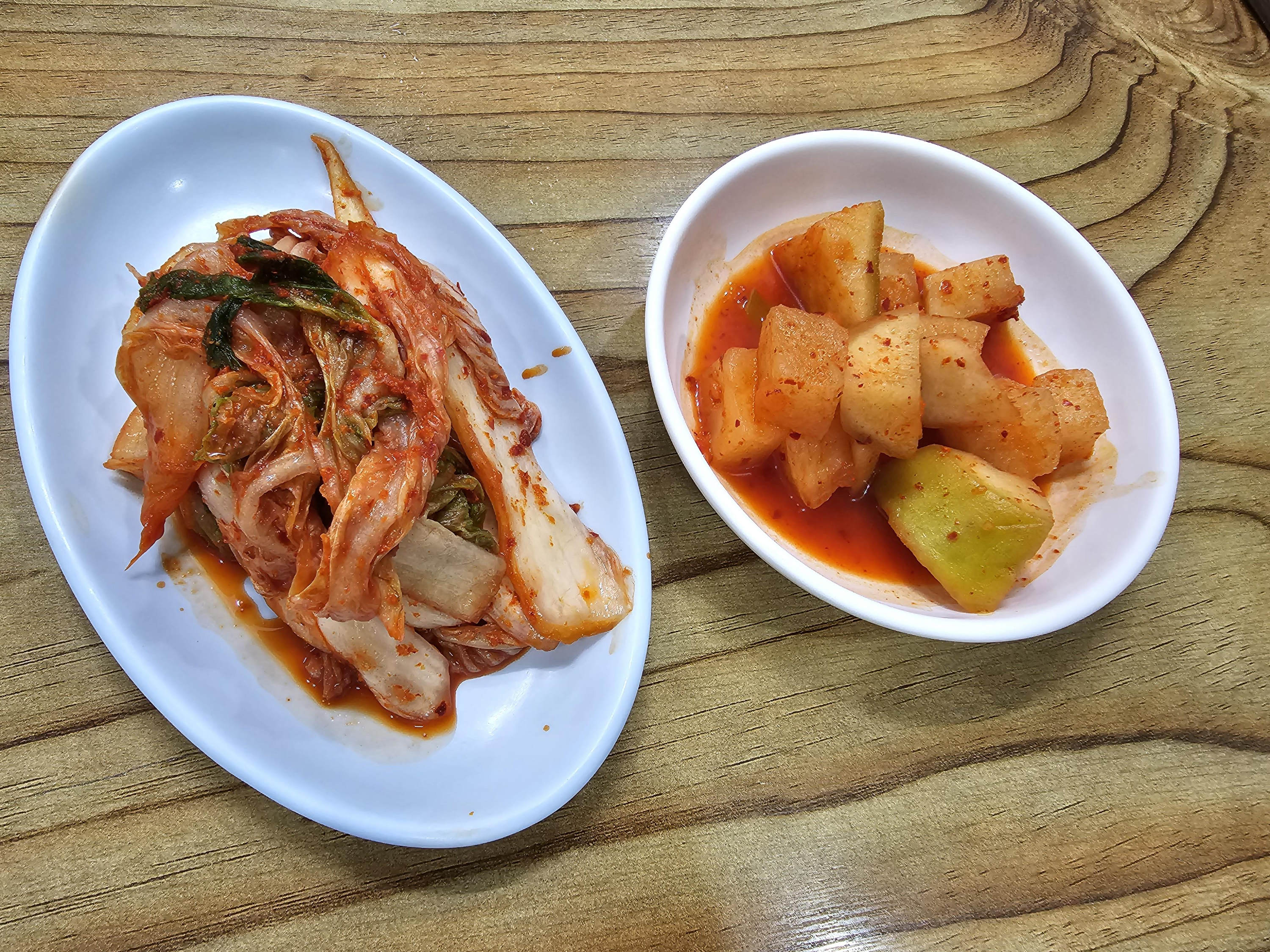 반찬으로는 김치와 깍두기가 나옵니다. 둘다 평범한 맛이었는데 비빔칼국수라 그런지 김치에 손이 덜 갔습니다.