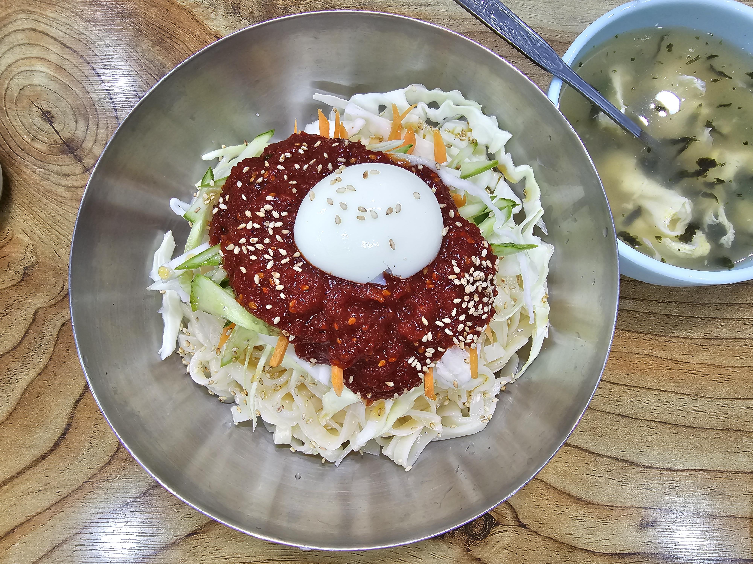 비빔칼국수는 계란국과 함께 나오고 칼국수 위에는 양배추와 오이, 양념장, 당근, 삶은 달걀 반 개가 올라가 있었습니다.