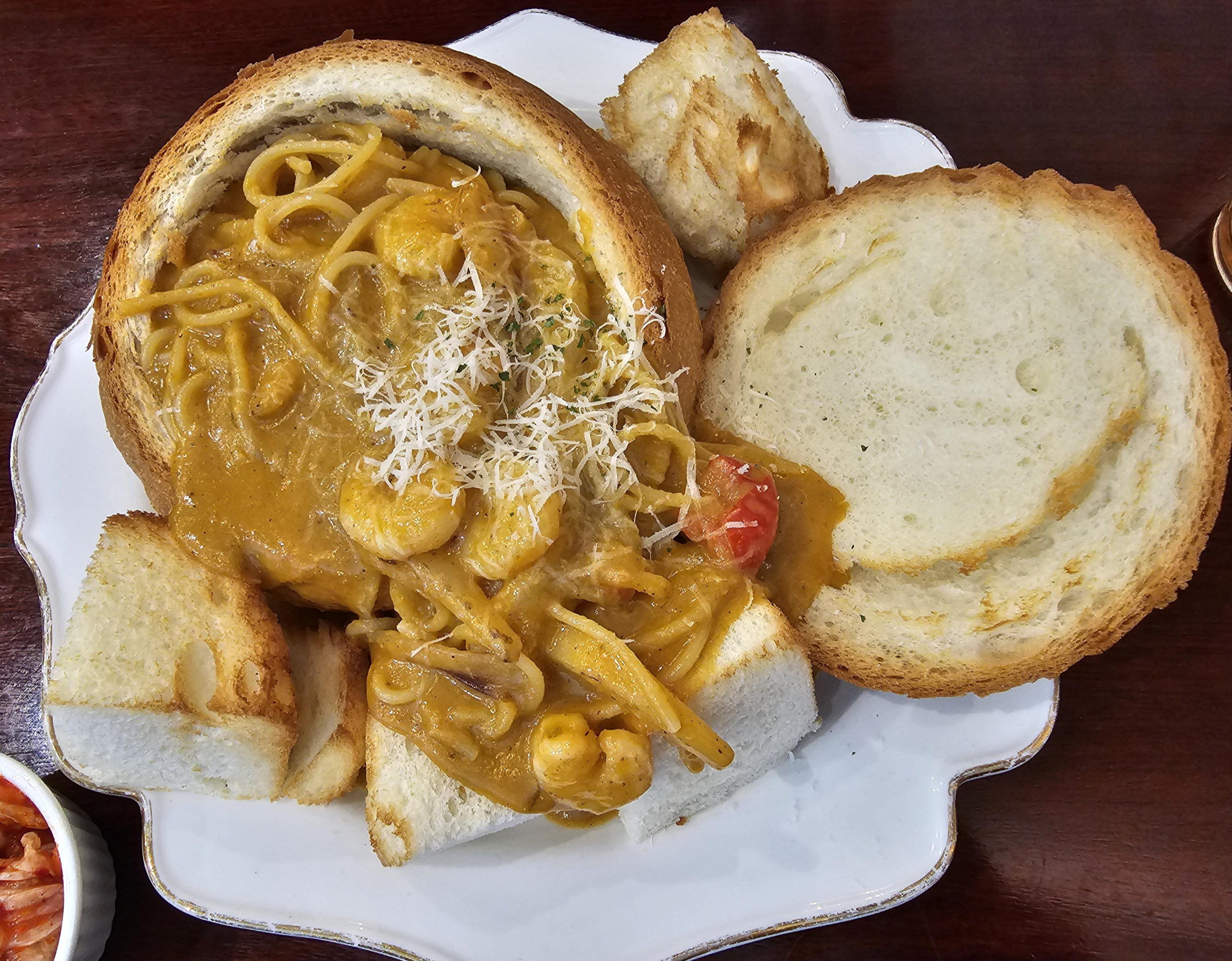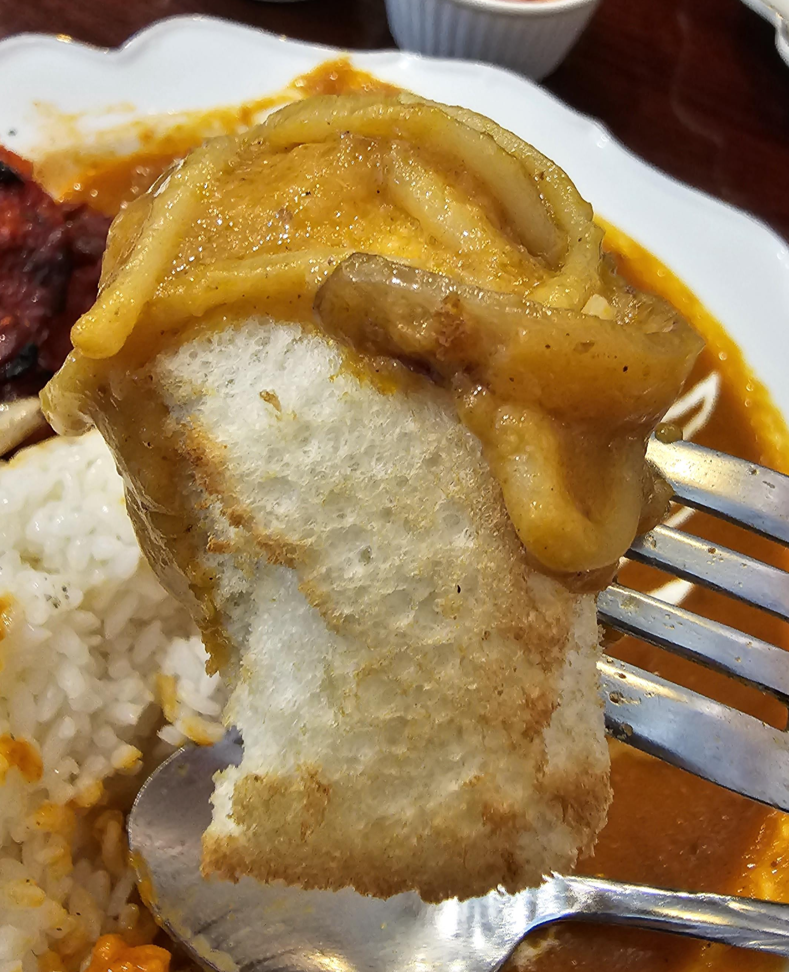 카레빠네는 빵 안에 카레파스타가 들어있는 형태였습니다. 본체인 빵 이외에도 빵이 4조각이 같이 나오는데, 빵이 부드럽고 맛있었습니다. 카레는 생각만큼 인도커리? 느낌은 아니었는데 생각해 보면 빠네니깐 인도 느낌이 안 날만하네요.