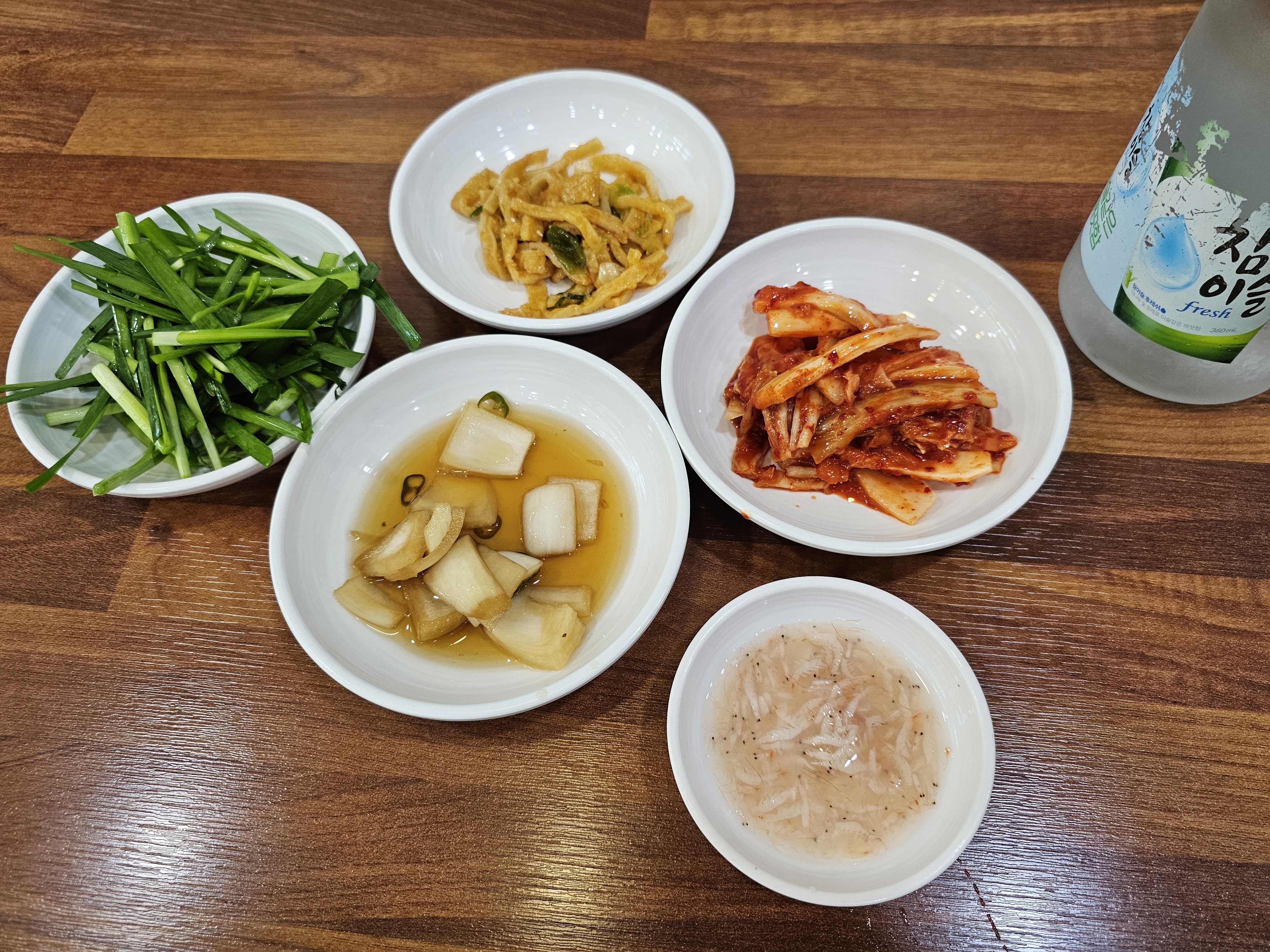 반찬으론 국밥에 넣는 부추와 어묵볶음, 김치, 양파장아찌와 새우젓이 나옵니다. 어묵볶음이 다른 집보다 더 고소하고 짭짤해서 맛있었고, 김치도 국밥과 잘 어울렸습니다. 테이블에는 다데기와 후추가 있어서 취향껏 국밥에 추가해서 먹을 수 있었습니다.