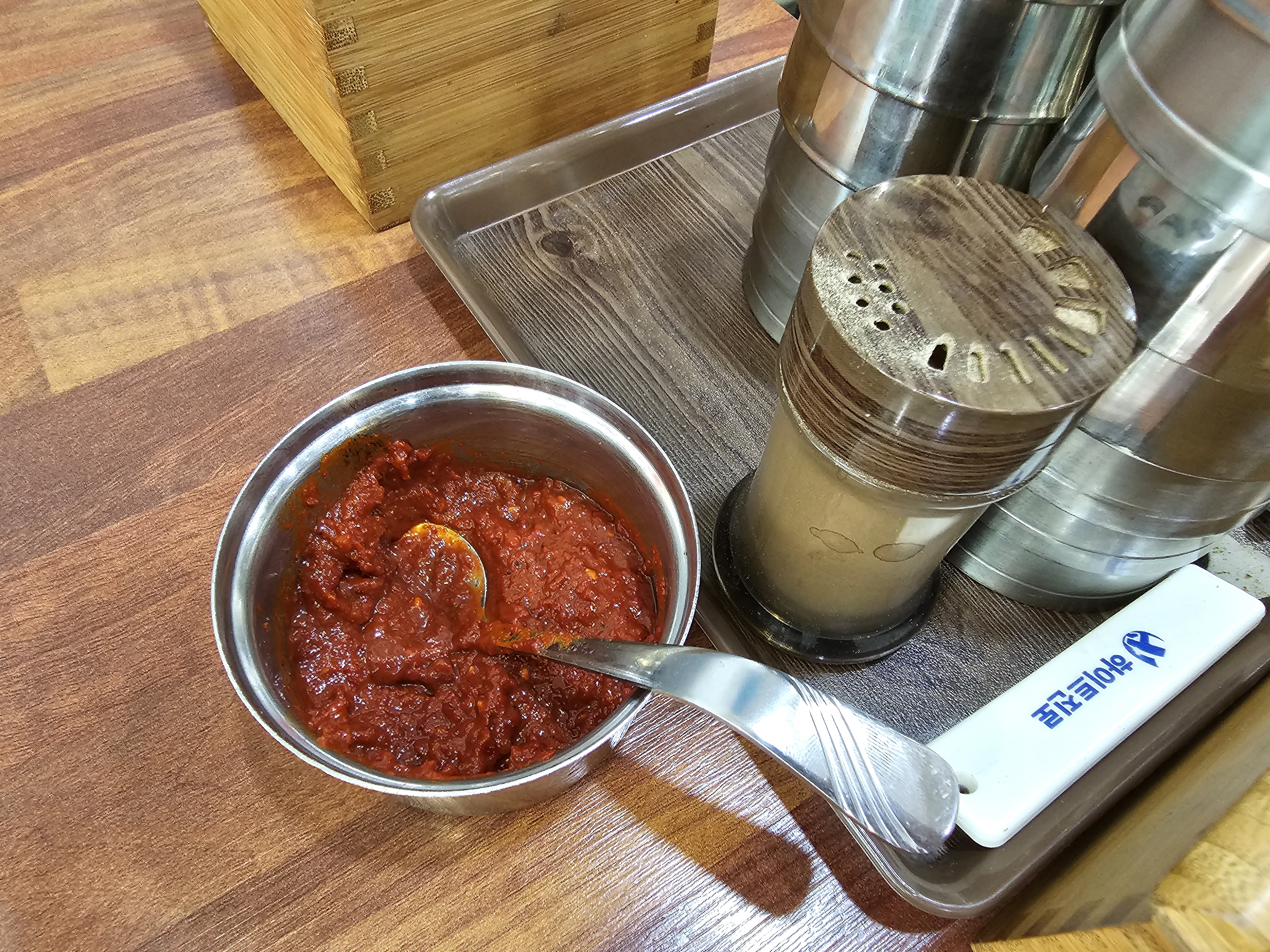 반찬으론 국밥에 넣는 부추와 어묵볶음, 김치, 양파장아찌와 새우젓이 나옵니다. 어묵볶음이 다른 집보다 더 고소하고 짭짤해서 맛있었고, 김치도 국밥과 잘 어울렸습니다. 테이블에는 다데기와 후추가 있어서 취향껏 국밥에 추가해서 먹을 수 있었습니다.