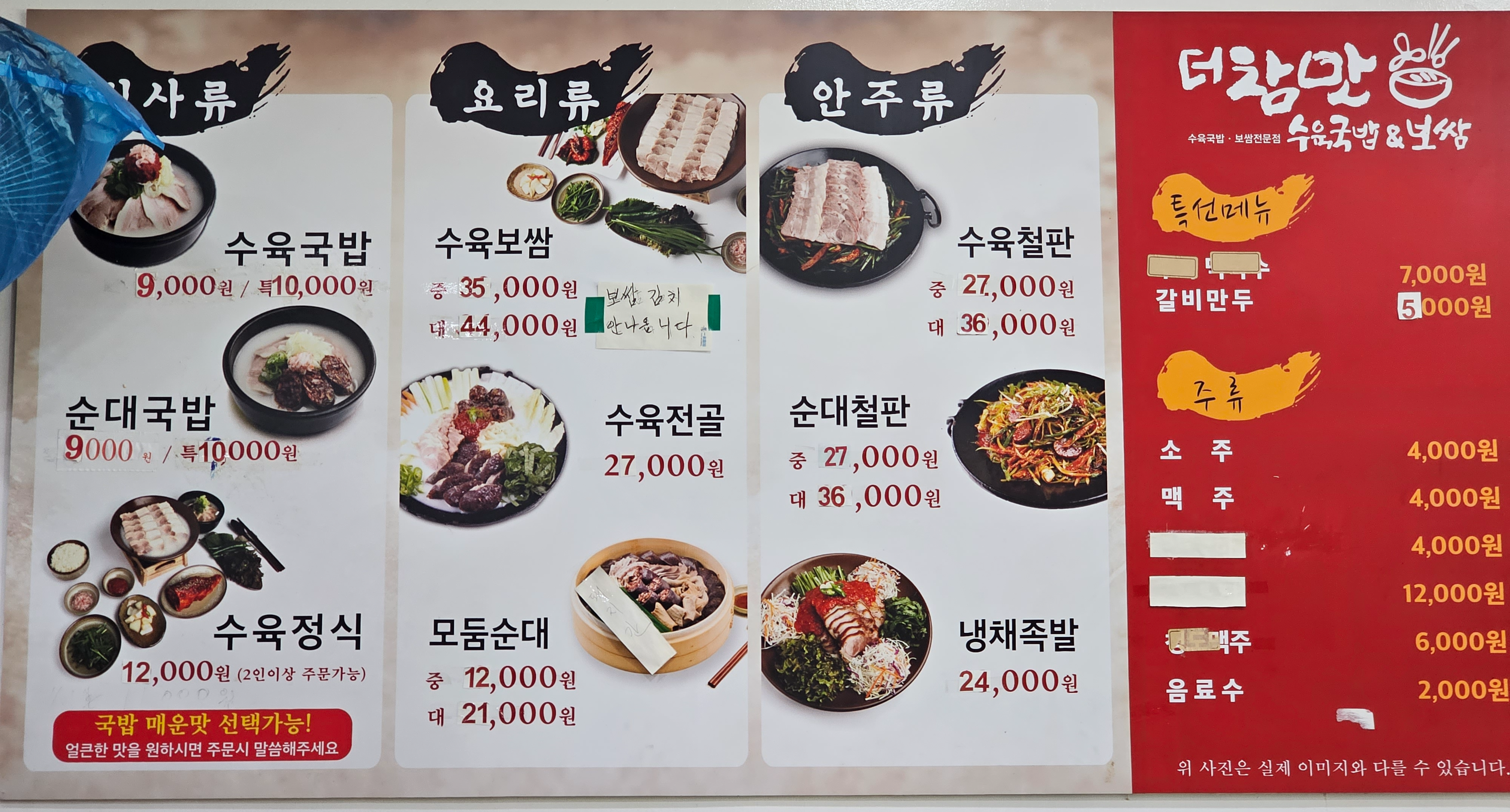 점심메뉴는 수육국밥과 순대국밥 그리고 수육정식을 팔고 있었습니다. 국밥은 얼큰하게 해달라고 하면 매운맛으로 준다고 하네요.