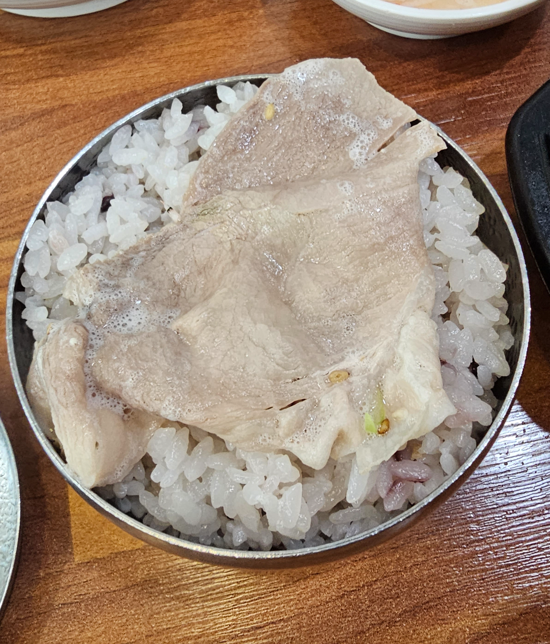 수육국밥에는 고기 부위는 목전지살이 들어간 것 같았습니다. 특답게 꽤 고기가 많이 들어있었고, 고기는 한 장 한 장이 얇아서 밥 말아서 먹을 때 적당히 밥알과 고기가 어울리게 먹기 편해서 좋았습니다.