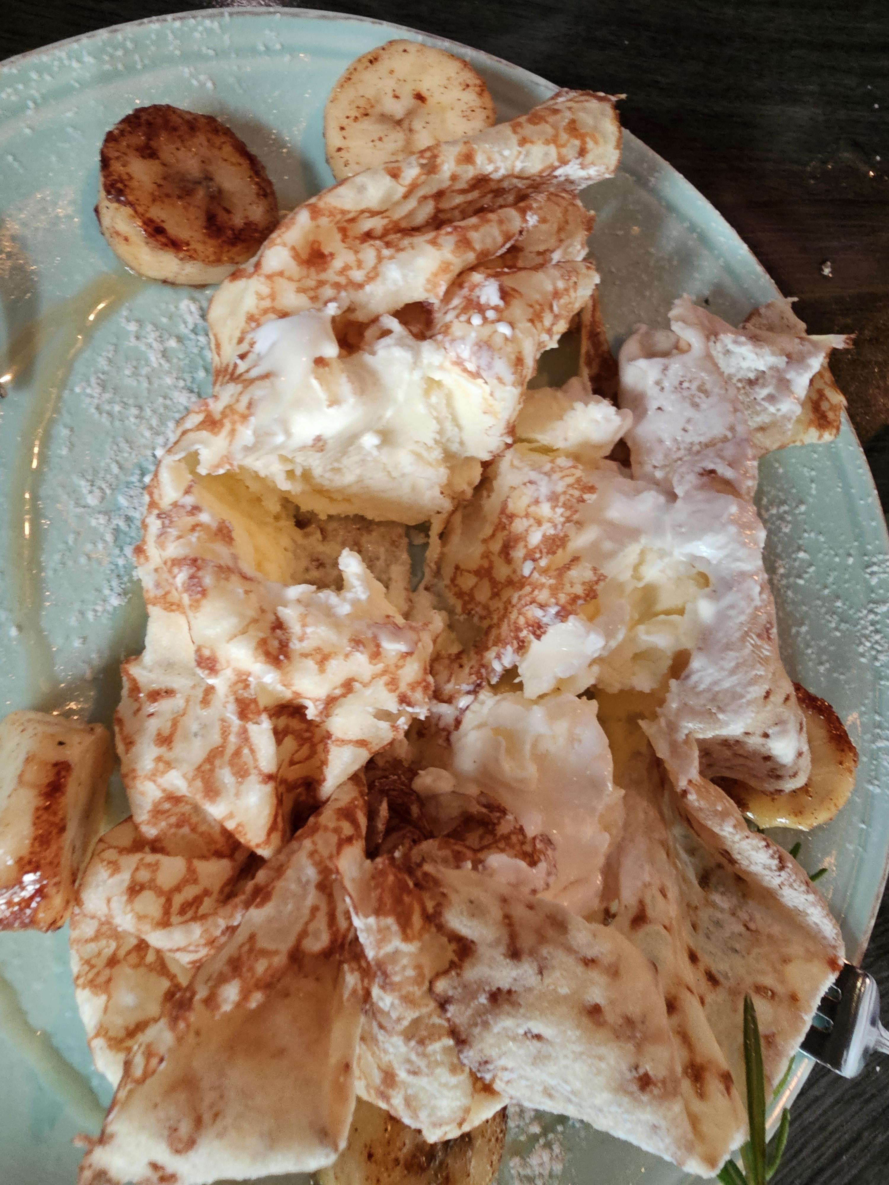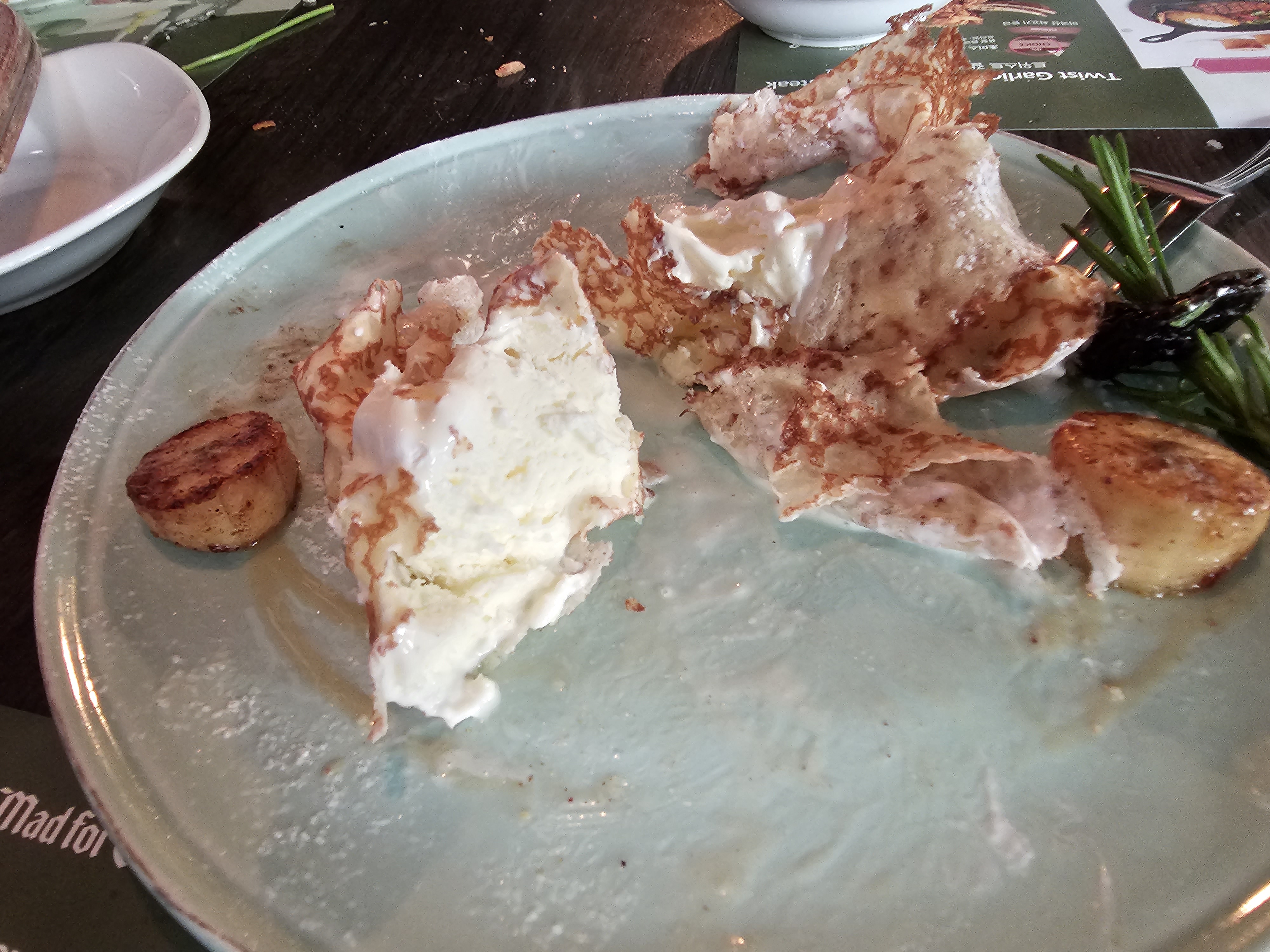 바나나 크레이프 파우치는 크레이프에 바닐라 아이스크림이 쌓여있는 디저트였습니다. 크레이프 파우치 주변으로 구운 바나나? 조린 바나나? 조각이 있었는데, 그냥 달달한 바나나 맛이었습니다. 크레이프 자체는 밀가루와 아이스크림의 조화라 달달하고 맛있었습니다. 약간 계피? 맛도 나는 것 같았고 맛있게 먹었네요.
